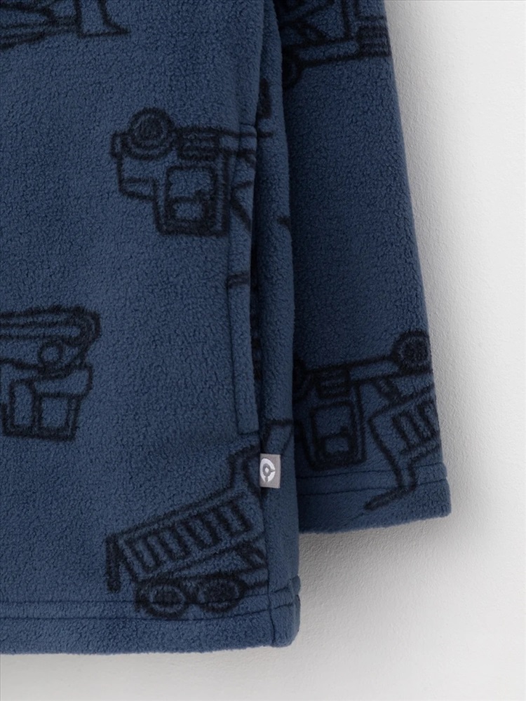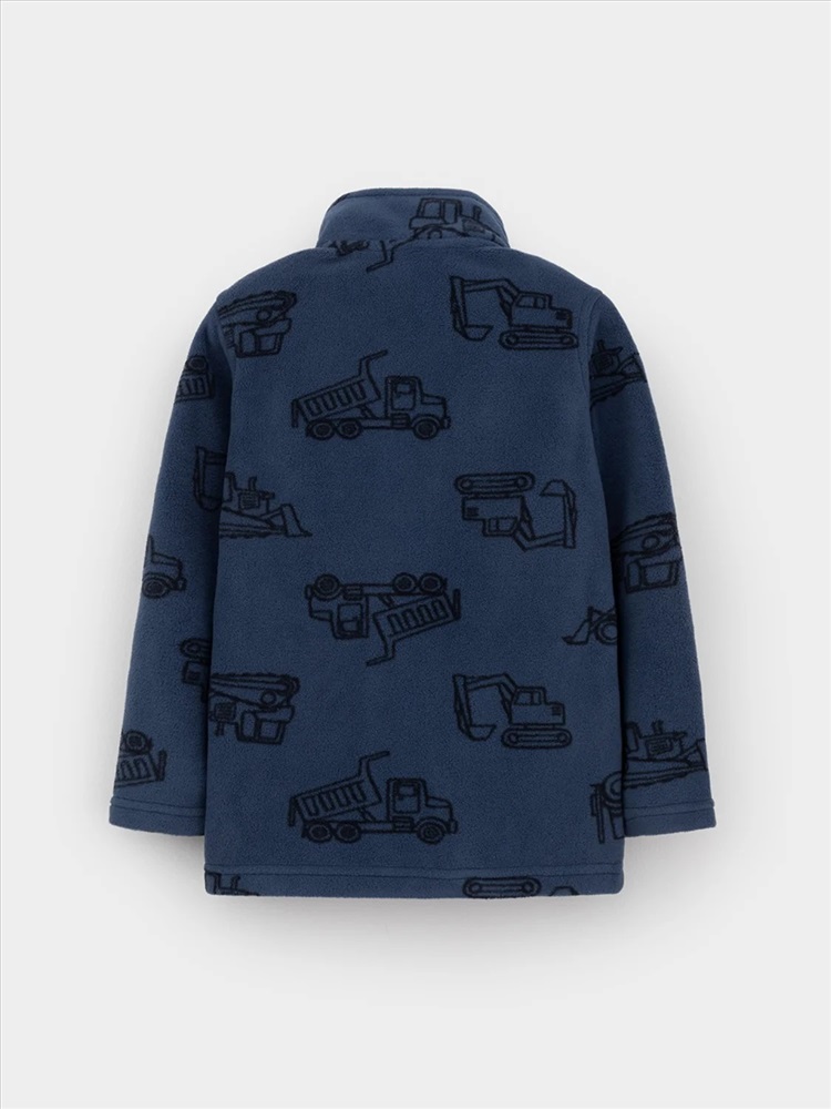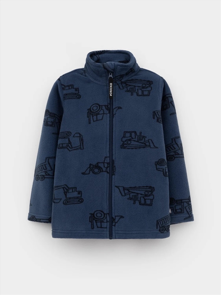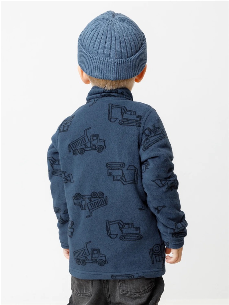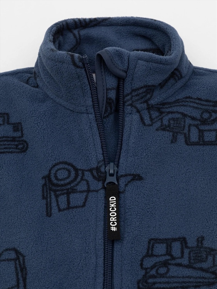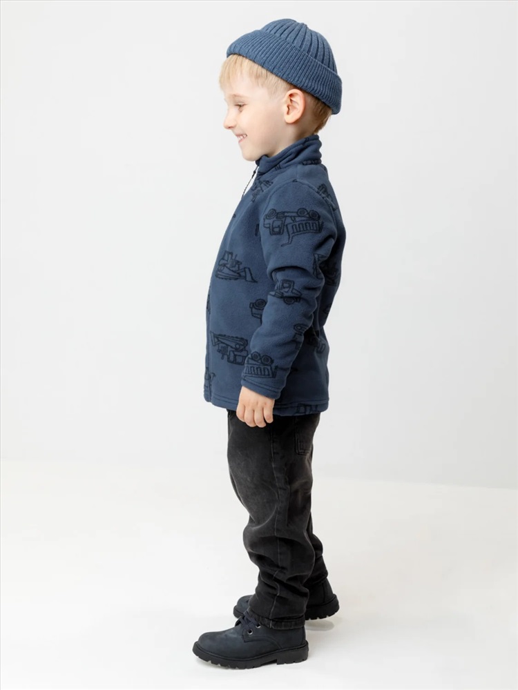 Флисовая куртка для мальчика. У изделия высокий воротник и застёжка на молнию с мягкой защитой шеи и подбородка. По бокам два кармана. Оригинальная набивка выполнена из стойких гипоаллергенных текстильных красителей. Куртка сохраняет цвет и форму после многократных стирок.
