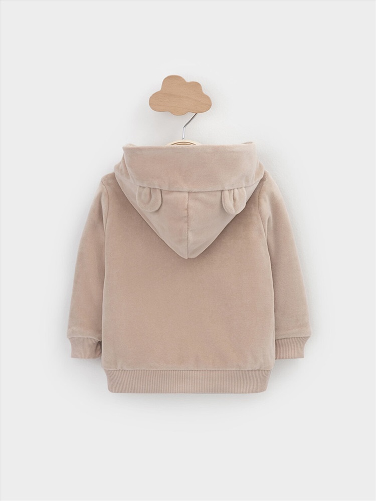 Тёплая куртка из велюра для новорождённых. Внутри синтепон и подклад из натурального хлопка. Изделие застёгивается на молнию и имеет капюшон. На рукавах мягкие манжеты, внизу - эластичный пояс. Спереди два накладных кармана и украшение в виде вышивки. Все трикотажные полотна производятся в соответствии с нормами Швейцарского сертификата ЭкоТекс.
