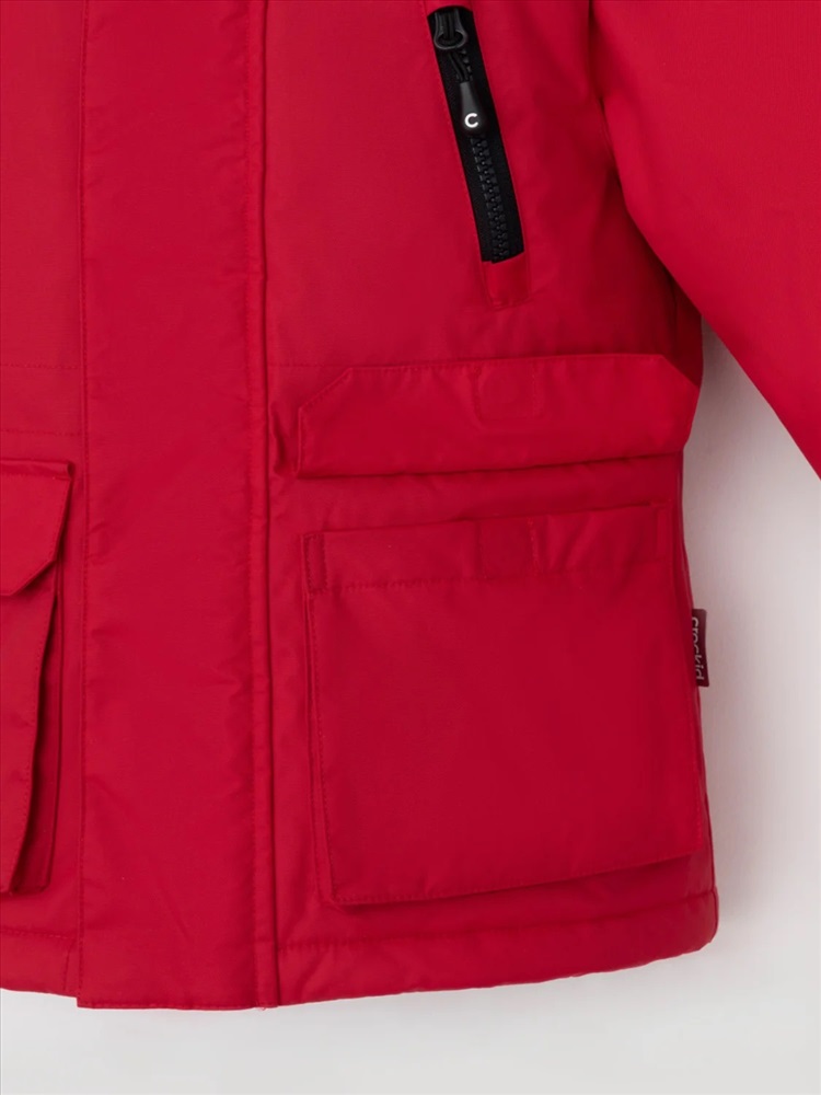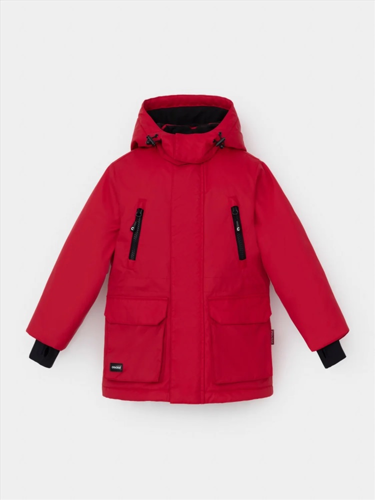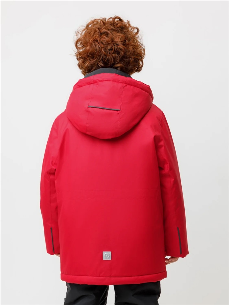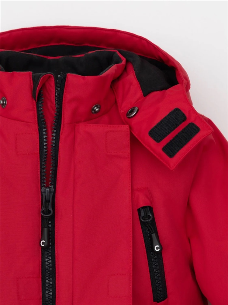 Зимняя куртка для мальчика с утеплителем SEE®: 250 г/м2. Выполнена из мембранной ткани с дополнительной тефлоновой обработкой, которая предохраняет изделие от загрязнений и отталкивает влагу. Подклад выполнен из 100% полиэстера Tricot. Куртка застёгивается на молнию и внешнюю планку с магнитными кнопками, предусмотрена защита подбородка. Съёмный капюшон на кнопках и липучках имеет эластичную утяжку со стопперами. На рукавах внутренние эластичные манжеты. Два накладных кармана с клапанами по бокам и два кармана с молниями на груди. По талии эластичная утяжка со стопперами. Во всех изделиях верхнего ассортимента для безопасности ребёнка предусмотрены светоотражающие элементы.