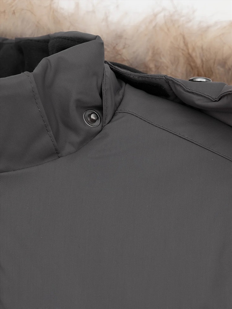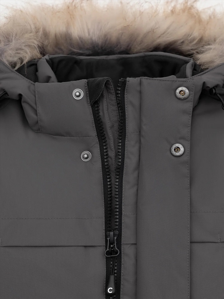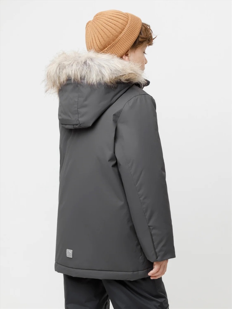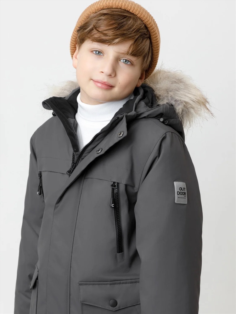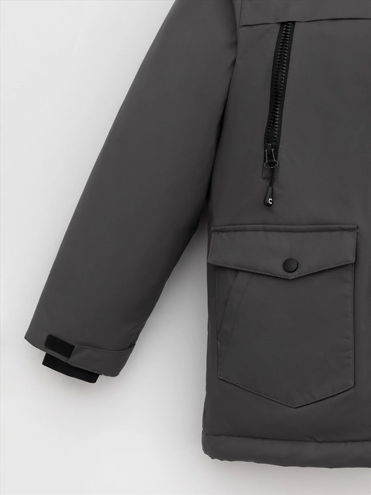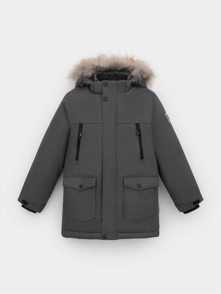 Зимняя куртка для мальчика с утеплителем SEE®: 250 г/м2. Выполнена из мембранной ткани с дополнительной тефлоновой обработкой, которая предохраняет изделие от загрязнений и отталкивает влагу. Подклад выполнен из 100% полиэстера Tricot. Куртка застёгивается на молнию и внешнюю планку с металлическими кнопками, предусмотрена защита подбородка. Съёмный капюшон на кнопках и липучках имеет эластичную утяжку со стопперами и отстёгивающуюся опушку из искусственного меха, регулируется по глубине. На рукавах внутренние эластичные манжеты, ширина рукава регулируется при помощи липучки. По бокам два накладных кармана и два кармана с молниями на груди. По талии эластичная утяжка со стопперами. Во всех изделиях верхнего ассортимента для безопасности ребёнка предусмотрены светоотражающие элементы.
