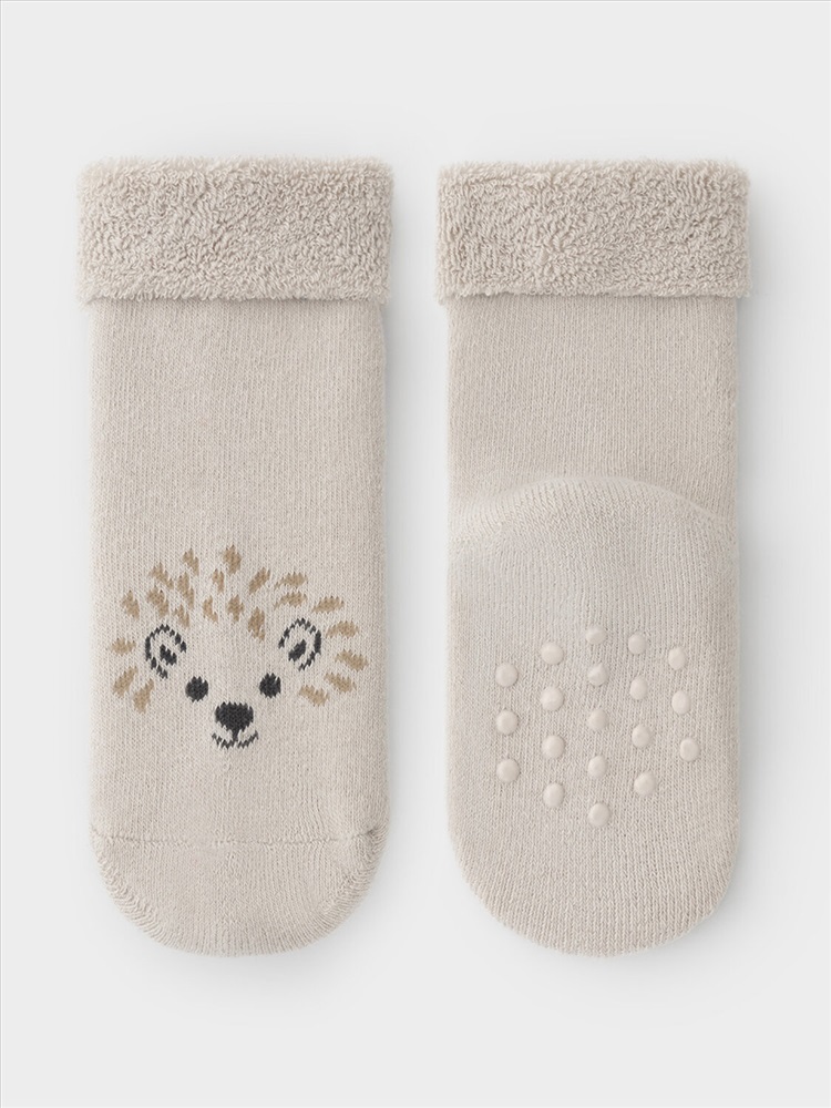 Носки махровые с формованной пяткой и отворотом по краю. На подошве резиновые стопперы. Украшены рисунком. Изделие сохраняет форму и стойкий цвет после многочисленных стирок.