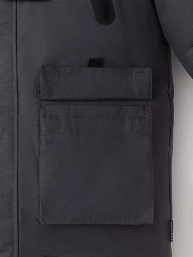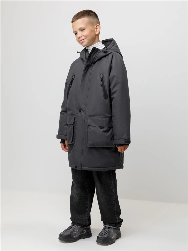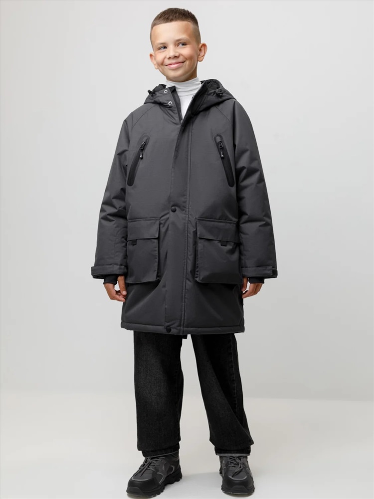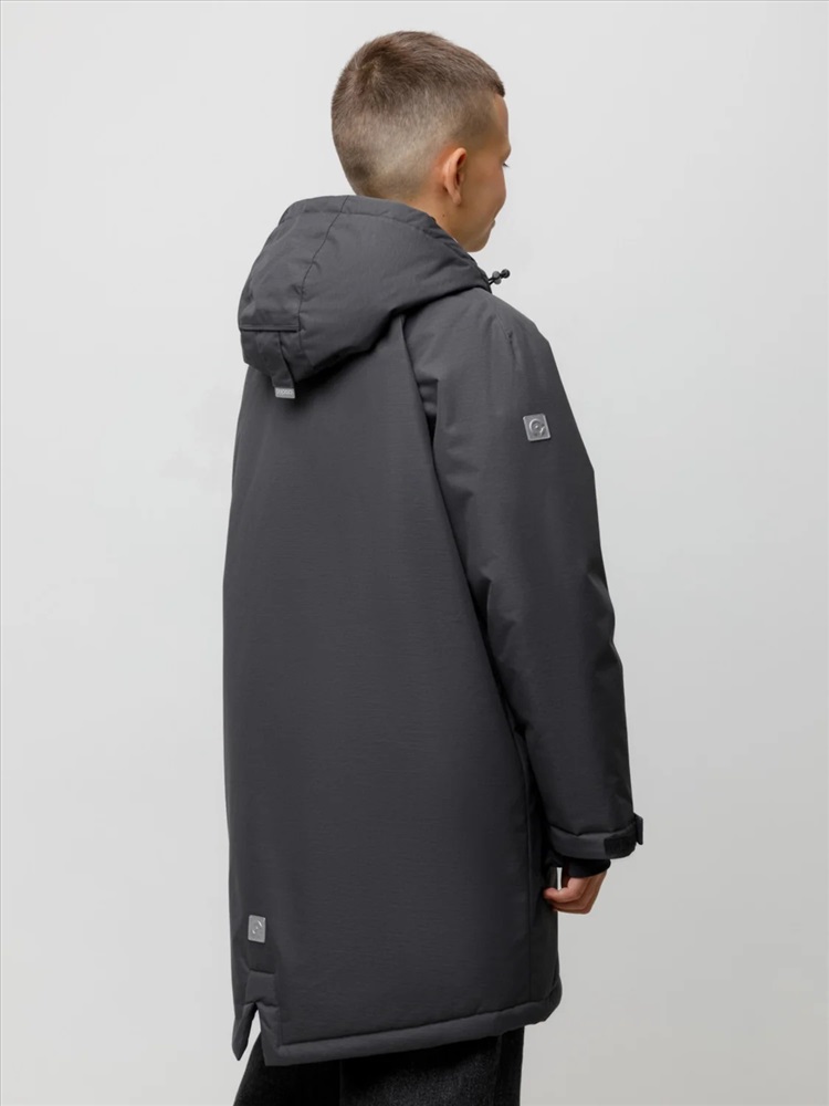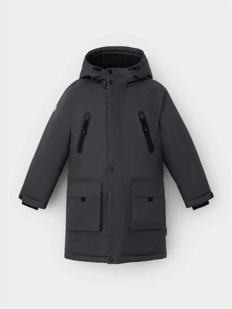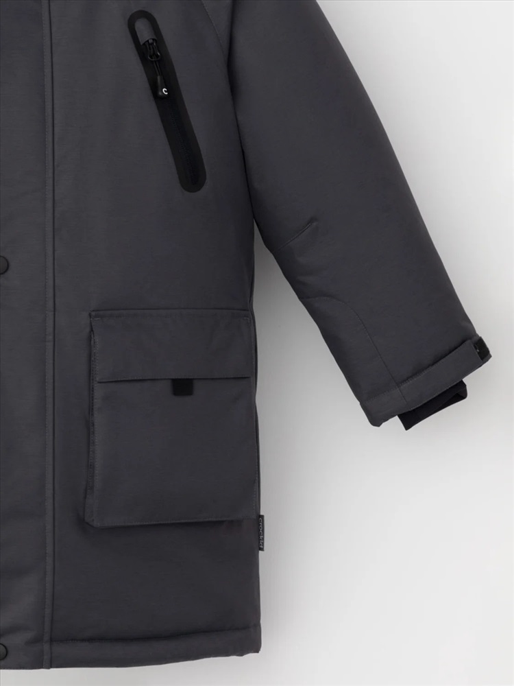 Зимняя парка для мальчика с утеплителем Fellex®: 300 г/м2. Выполнена из мембранной ткани с дополнительной тефлоновой обработкой, которая предохраняет изделие от загрязнений и отталкивает влагу. Подклад выполнен из 100% полиэстера Tricot. Парка застёгивается на молнию и внешнюю планку с кнопками, предусмотрена защита подбородка. Вшитый капюшон затягивается на эластичную утяжку со стопперами и на шнур. На рукавах внутренние эластичные манжеты, ширина регулируется липучками. Два накладных кармана с клапанами по бокам и два кармана на груди. По талии эластичная утяжка со стопперами. Во всех изделиях верхнего ассортимента для безопасности ребёнка предусмотрены светоотражающие элементы.