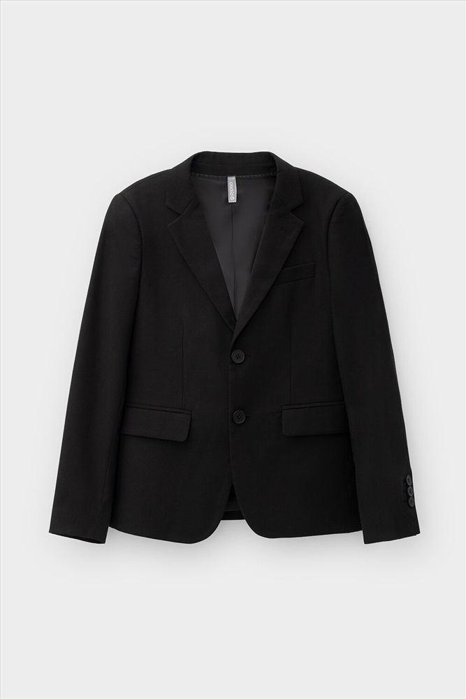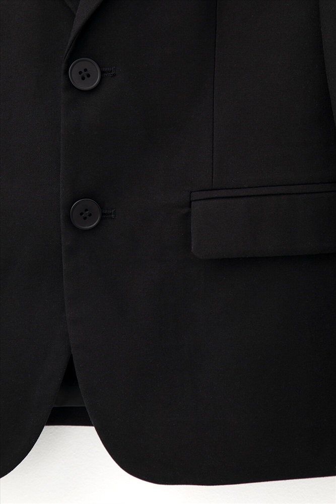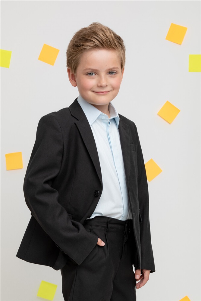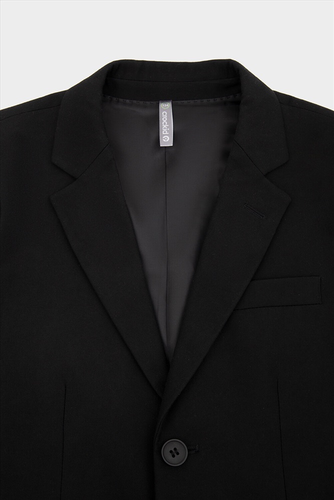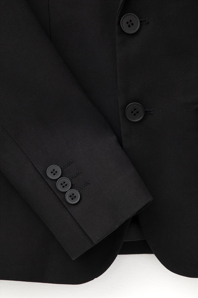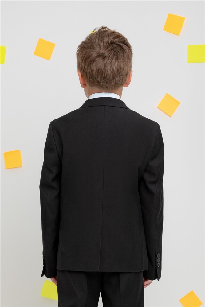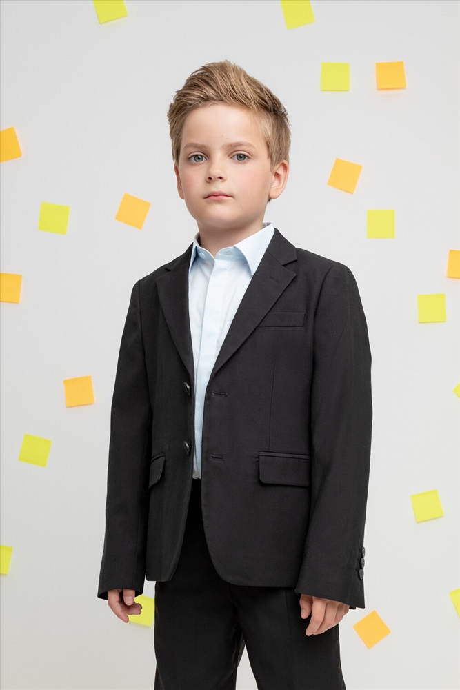 Классический школьный пиджак для мальчика. Cпереди застёгивается на две пуговицы. По бокам два кармана с клапанами. Сзади шлица. Рукава украшены рядом декоративных пуговиц.