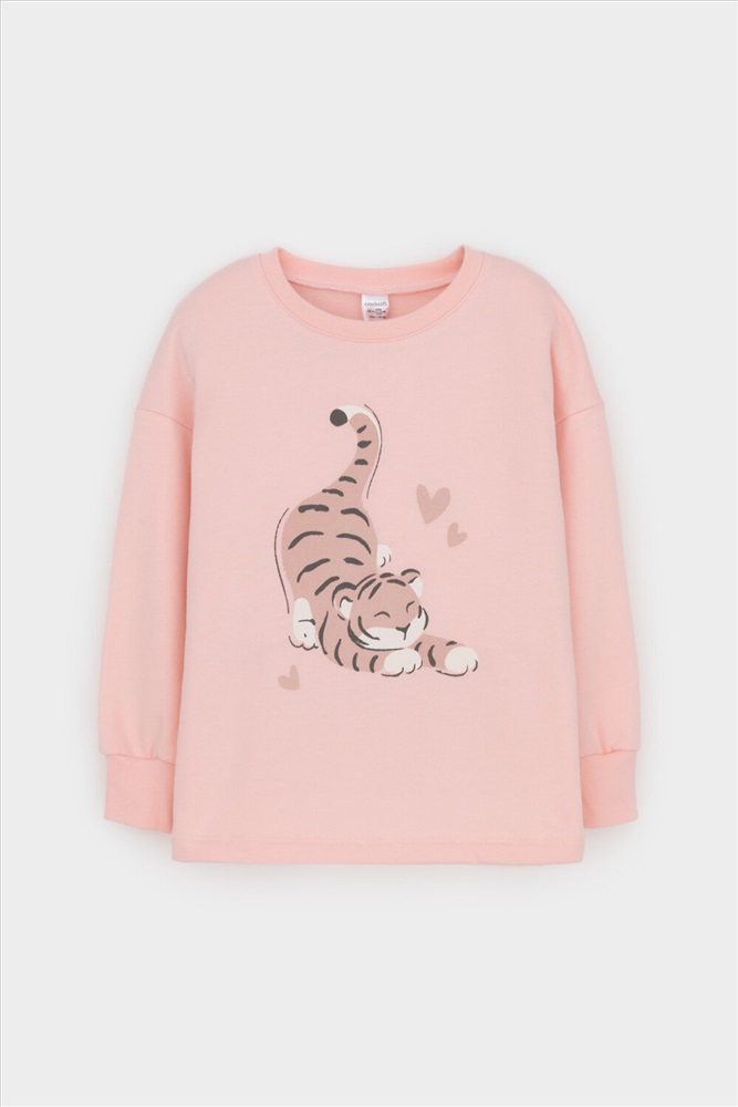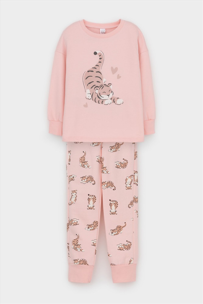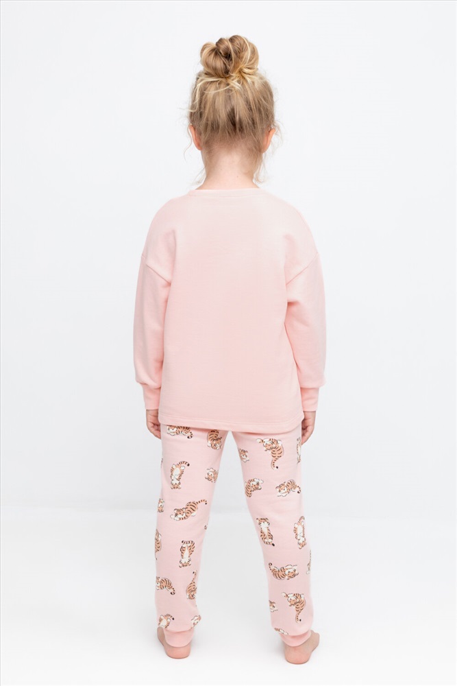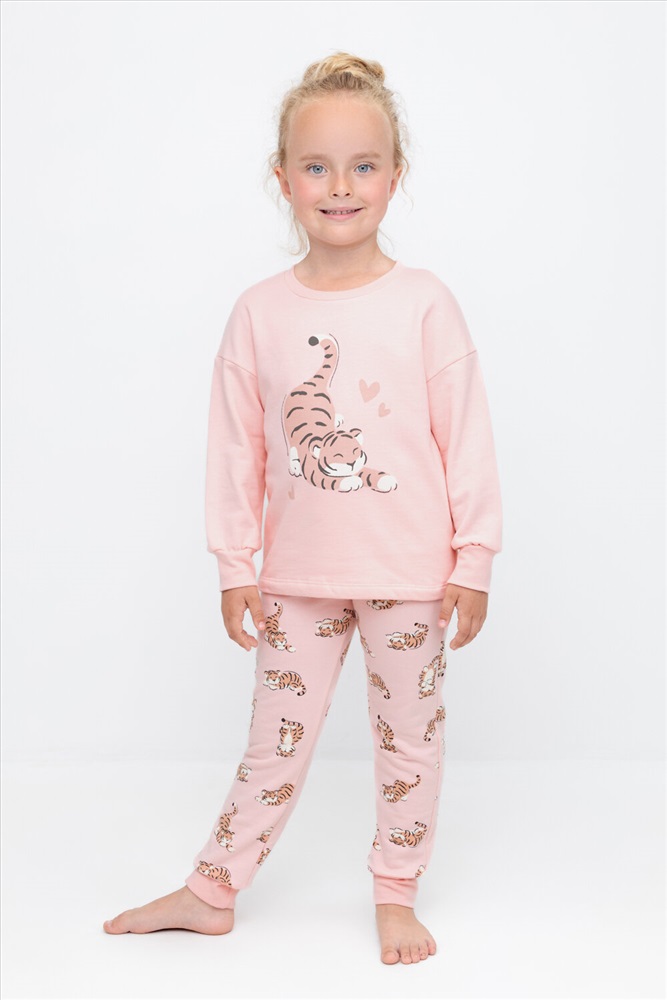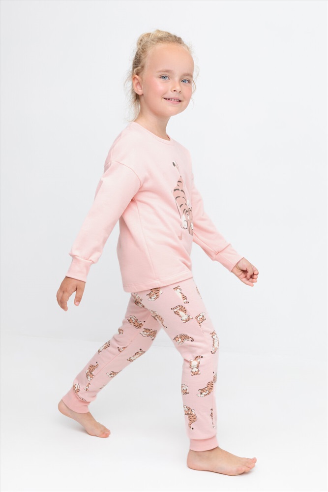 Трикотажный пижамный комплект из футера с начёсом, произведённого из натурального хлопка. У джемпера длинные рукава со спущенными плечами и эластичная мягкая горловина и манжеты. Брюки с удобным поясом на резинке, внизу манжеты. Оригинальная набивка и принт выполнены из стойких, гипоаллергенных текстильных красителей. Все трикотажные полотна производятся в соответствии с нормами Швейцарского сертификата ЭкоТекс.