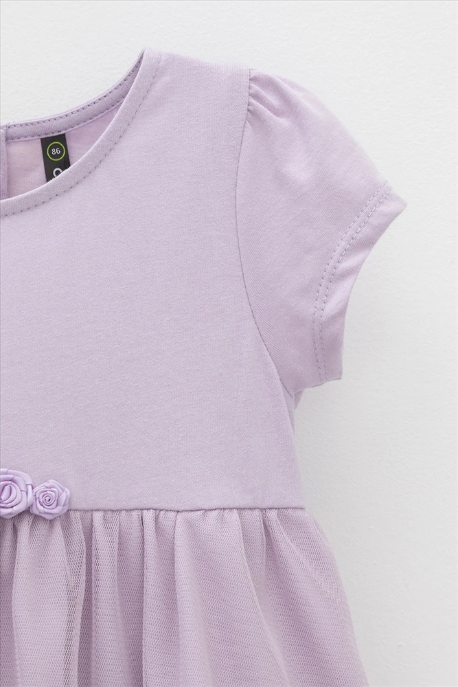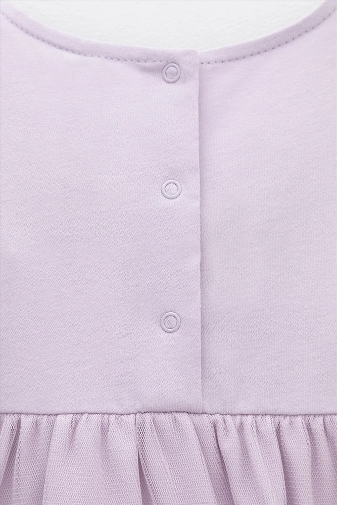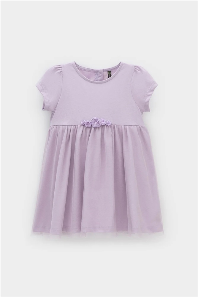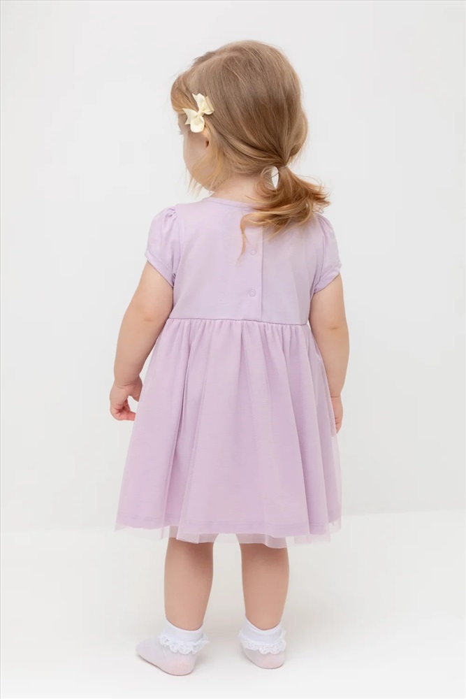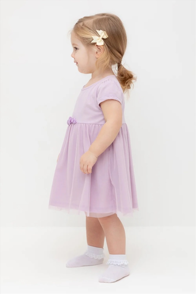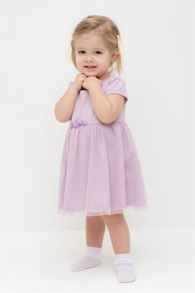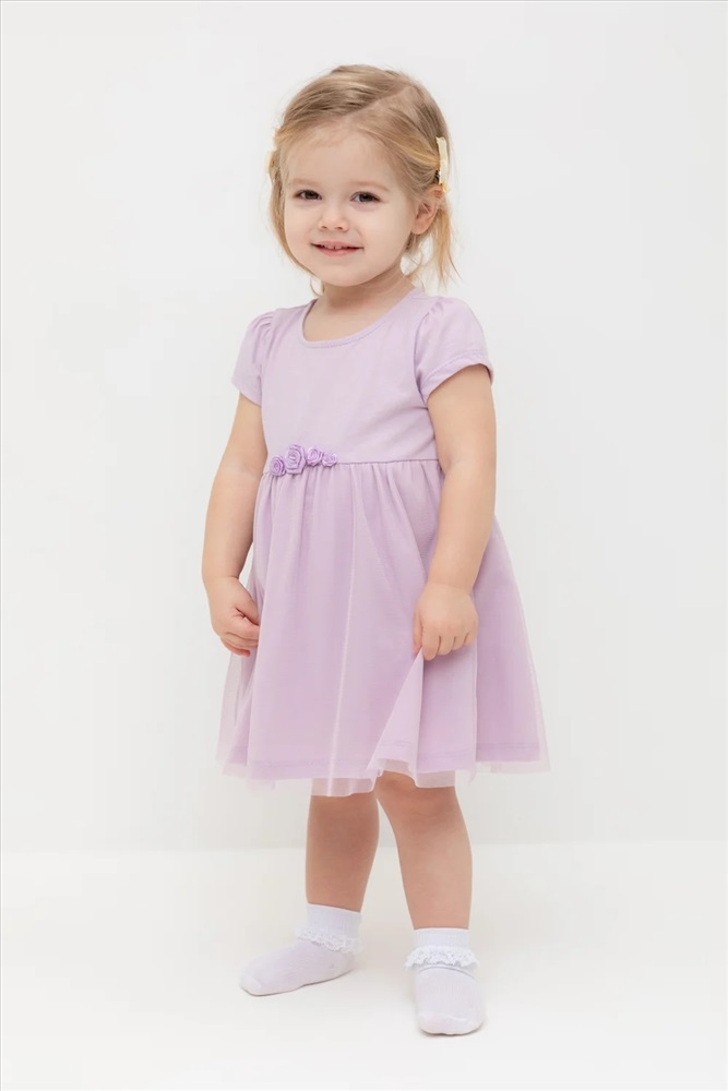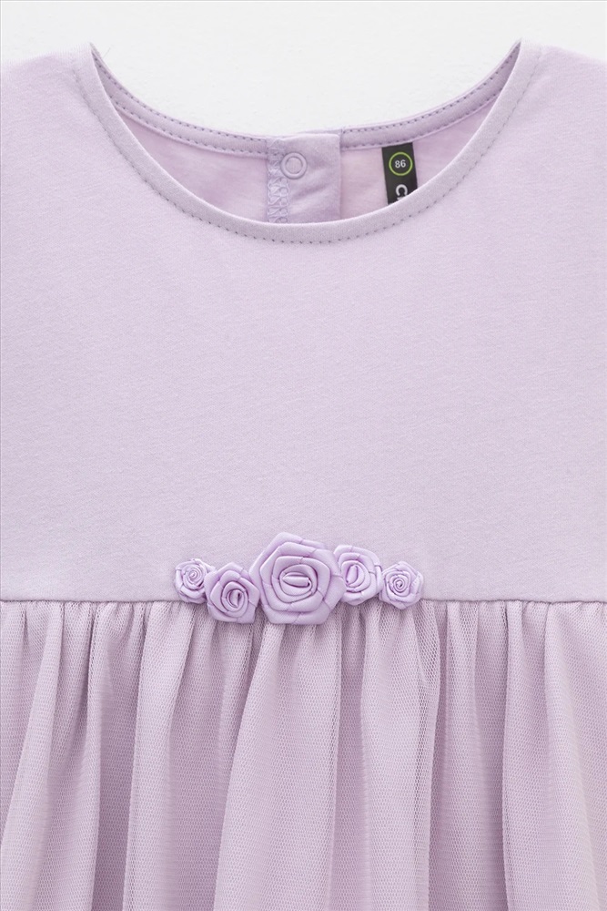 Нарядное платье-боди для девочки из высококачественного трикотажа супрем с лёгким слоем из сетки по юбке. Пояс украшен нежными атласными розочками. Для удобства одевания платье застёгивается на кнопки на спинке и по ножкам. Платье сохраняет форму и стойкий цвет после многочисленных стирок.