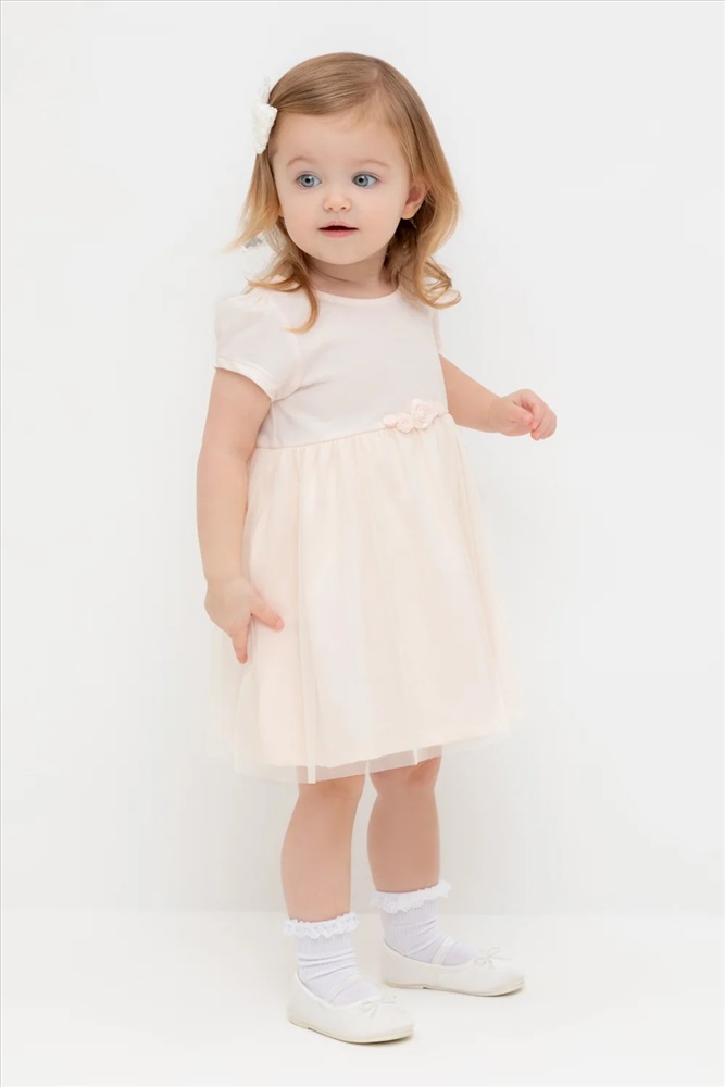 Нарядное платье-боди для девочки из высококачественного трикотажа супрем с лёгким слоем из сетки по юбке. Пояс украшен нежными атласными розочками. Для удобства одевания платье застёгивается на кнопки на спинке и по ножкам. Платье сохраняет форму и стойкий цвет после многочисленных стирок.