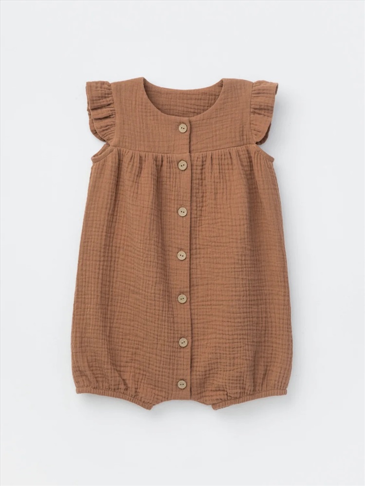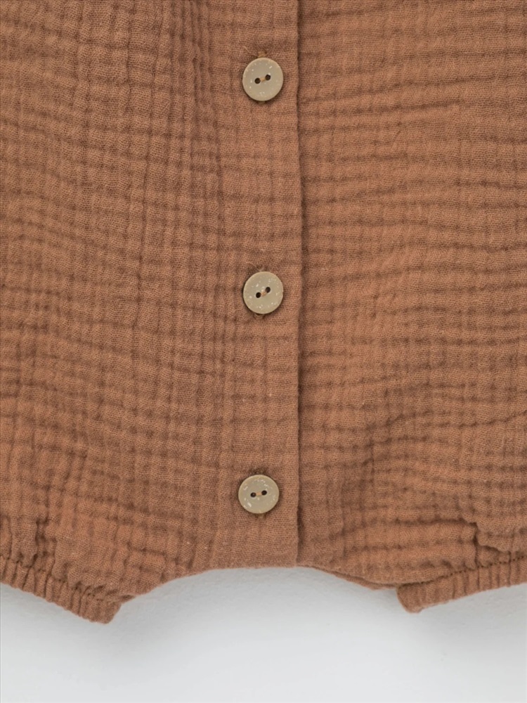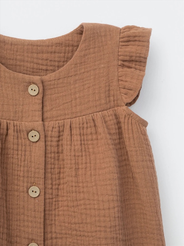 Легкий песочник для девочки из мягкого хлопокового муслина с застежкой на пуговицы. Изделие сохраняет цвет, форму и фактуру жатости после многократных стирок.