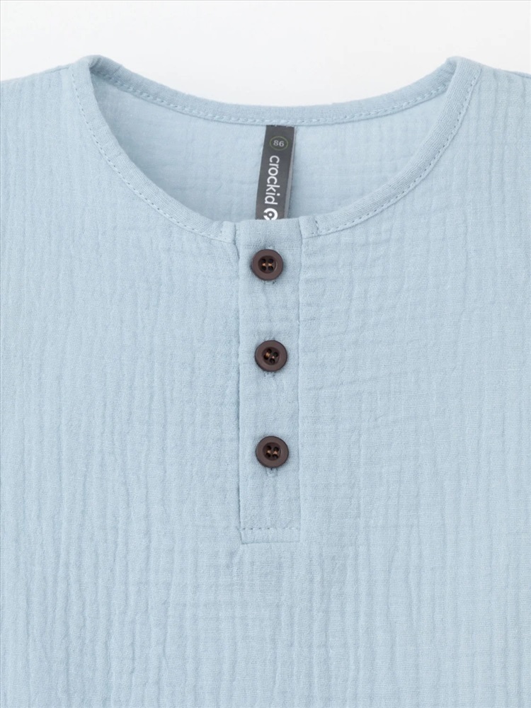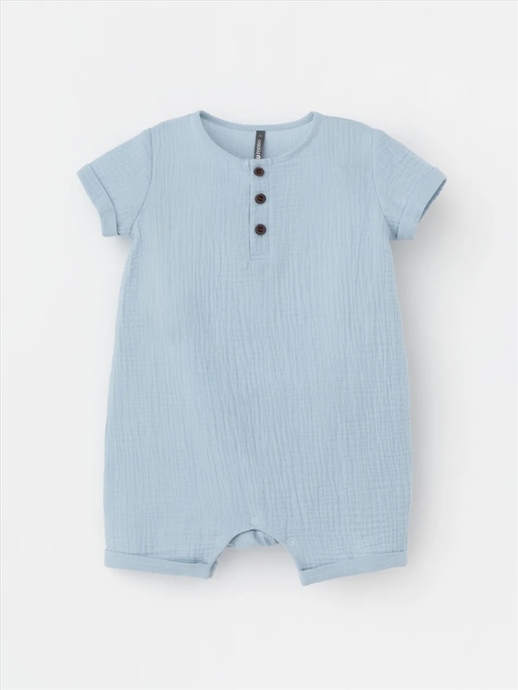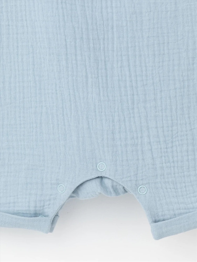 Легкий песочник для мальчика из мягкого хлопокового муслина с застежкой на пуговицы. Изделие сохраняет цвет, форму и фактуру жатости после многократных стирок.