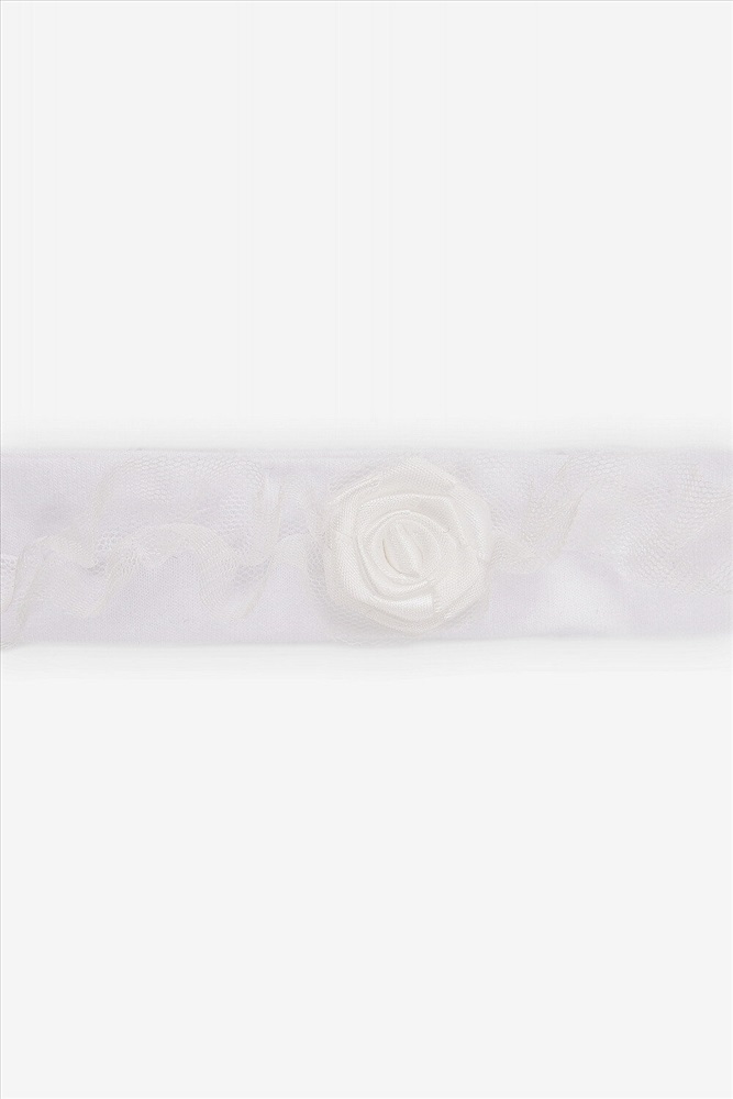 Повязка на голову для девочки из высокачественного хлопкового трикотажа супрем. В области затылка эластичная мягкая резинка. Украшена присборенной рюшей из сетки и декоративной розочкой. Все трикотажные полотна производятся в соответствии с нормами швейцарского сертификата ЭкоТекс.