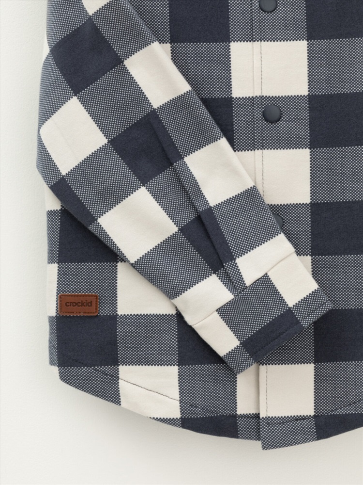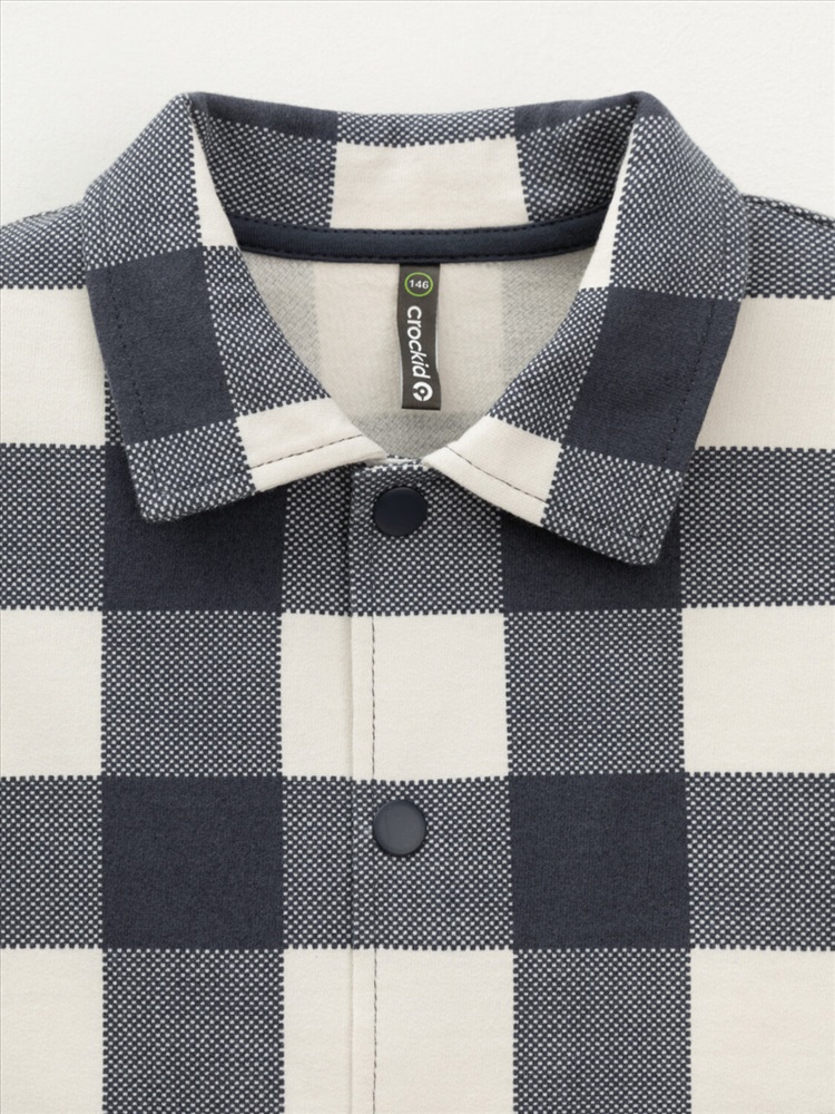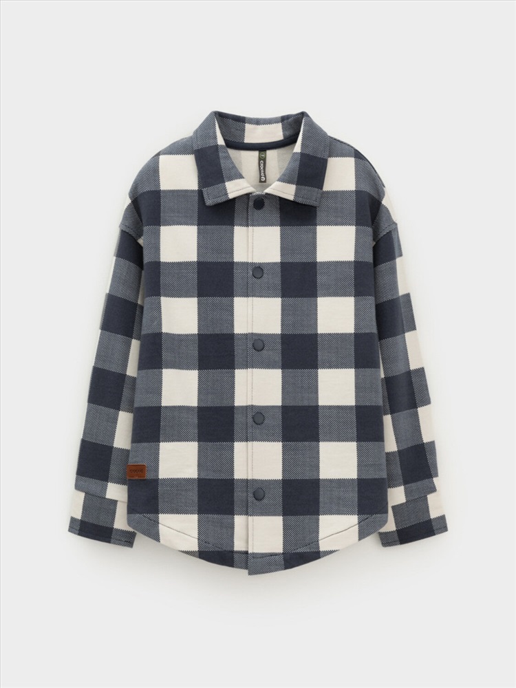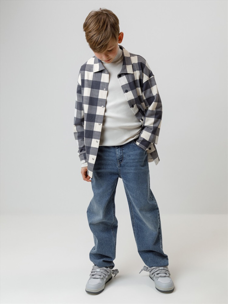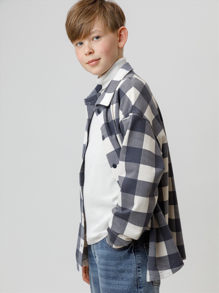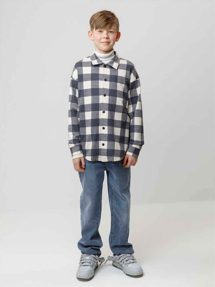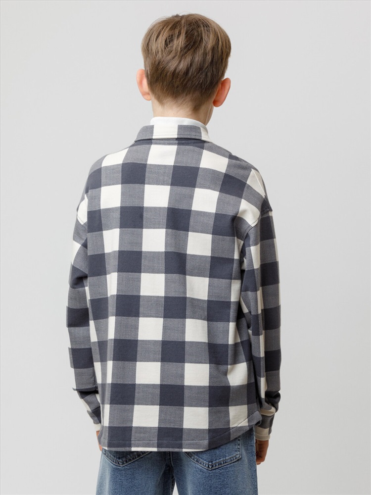 Свободная трикотажная рубашка для мальчика из мягкого петельчатого футера. Застёгивается на кнопки. Модель с закругленным низом и спущенным плечом. Рисунок в клетку выполнен из стойких текстильных гипоаллергенных красителей. Изделие сохраняет цвет и форму после многократных стирок. Все трикотажные полотна производятся в соответствии с нормами швейцарского сертификата ЭкоТекс.