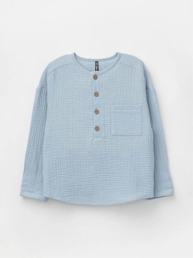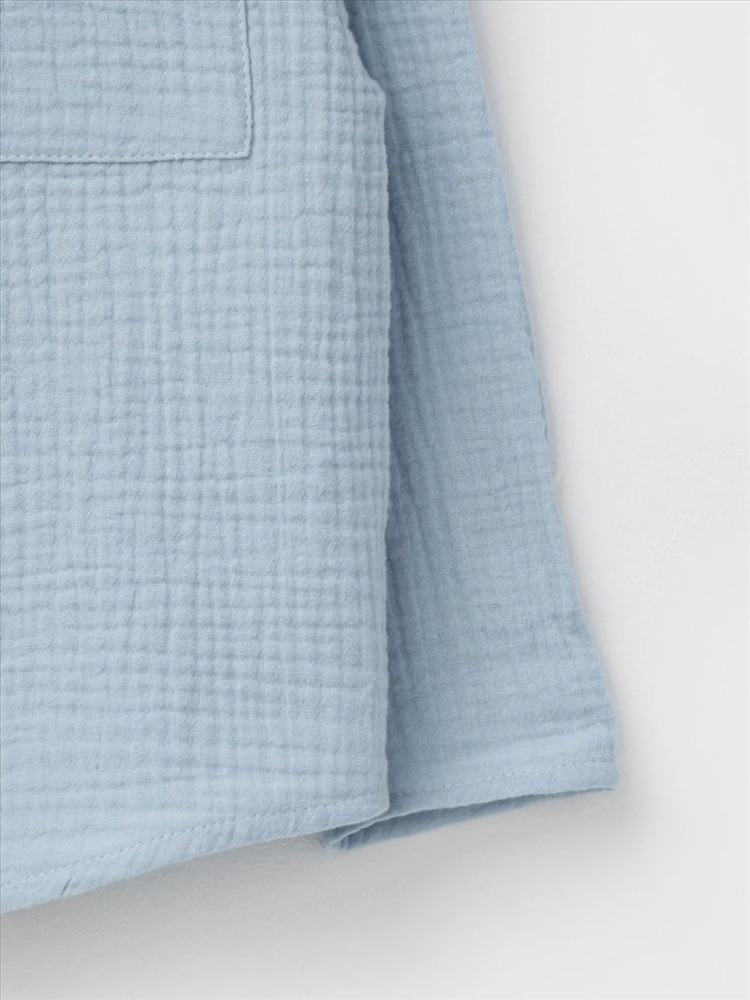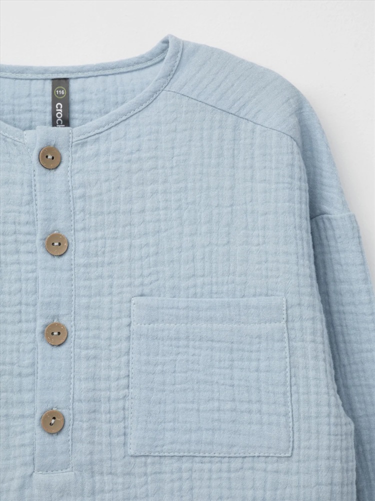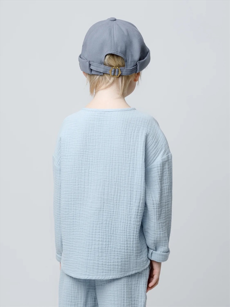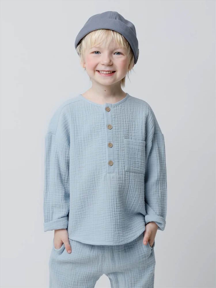 Легкая детская рубашка свободного кроя из мягкого хлопокового муслина, слегка спущенной линией плеча, длинными рукавами и с застежкой на пуговицы. Изделие сохраняет цвет, форму и фактуру жатости после многократных стирок.