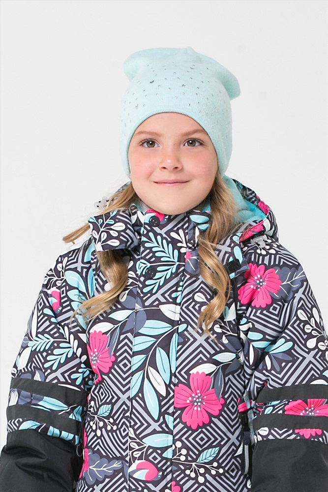 Шапка для девочки двухслойная из однотонной полушерстяной пряжи. Скругленная макушка. Нижняя часть украшена стразами.