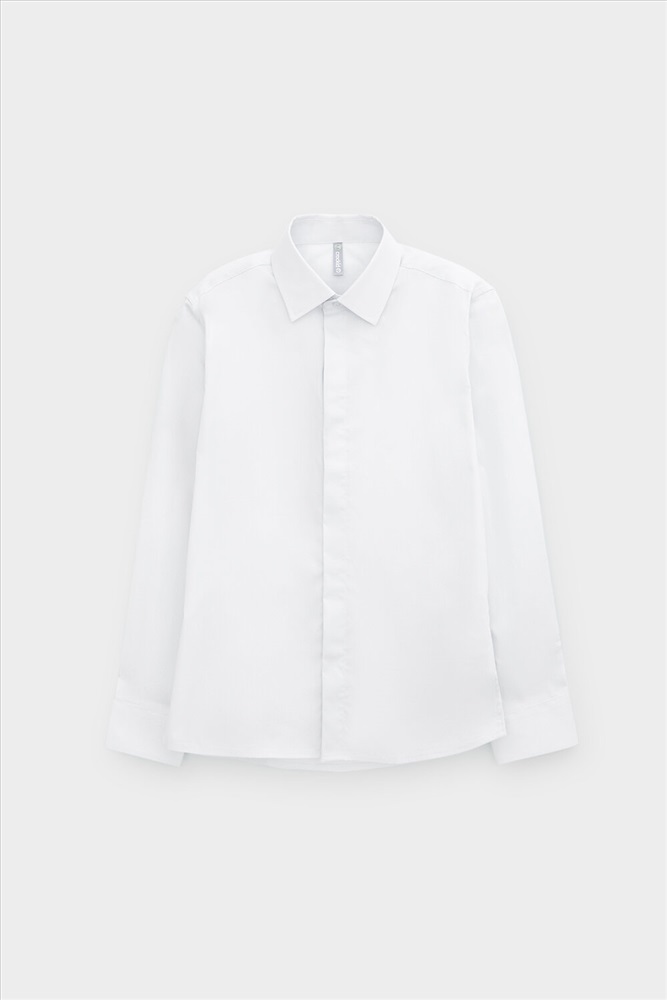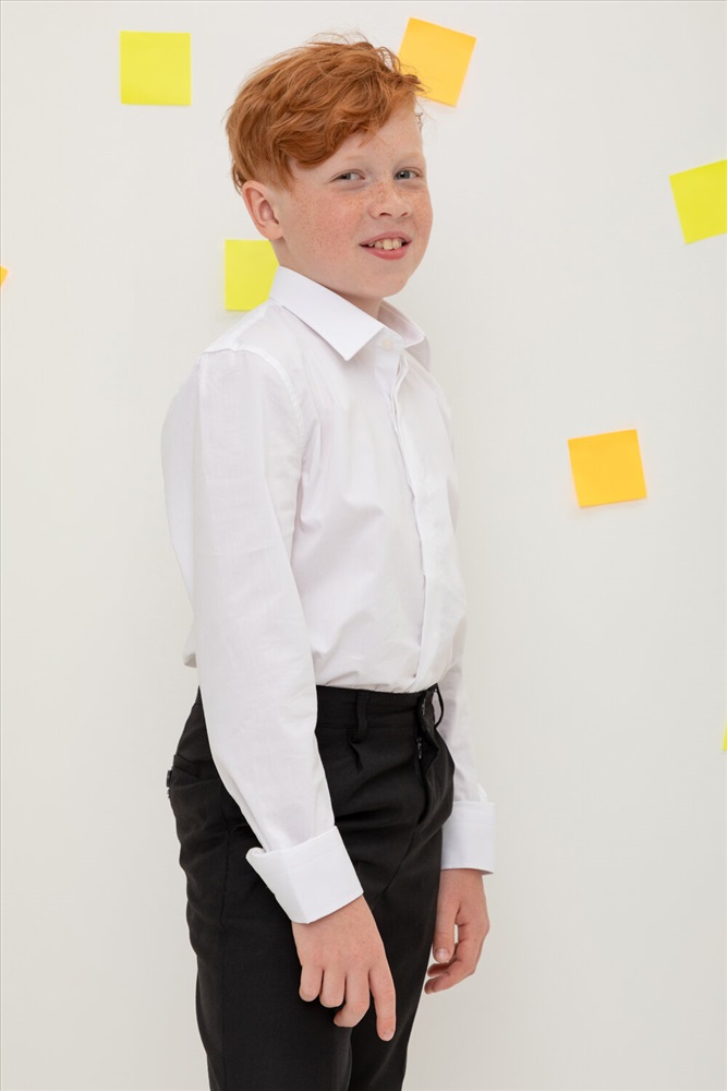 Классическая сорочка для мальчика с отложным воротником. Застегивается спереди на планку с потайными пуговицами. Длинные втачанные рукава с манжетами регулируются по ширине.