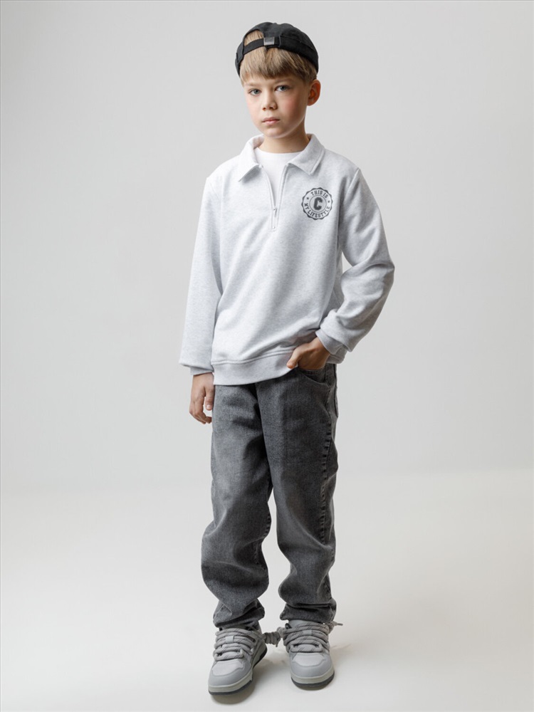 Свитшот с воротником для мальчика. Изготовлен из высококачественного петельчатого футера. В составе 80% натурального хлопка и 20% полиэстера, при этом полиэстер ввязан внутрь по особой технологии и не соприкасается с кожей. Манжеты и пояс выполнены из эластичного полотна. На груди короткая застёжка на молнию. Оригинальный принт выполнен из стойких текстильных гипоаллергенных красителей. Изделие сохраняет цвет и форму после многократных стирок.