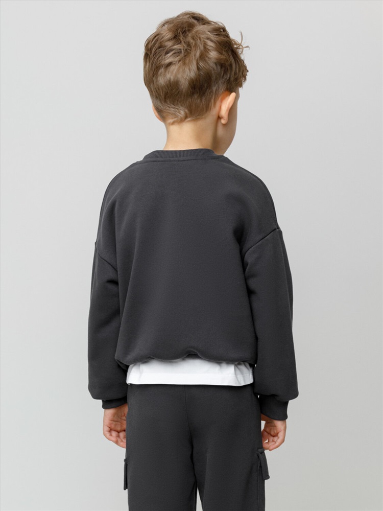 Свитшот для мальчика из высококачественного петельчатого футера. В составе 80% натурального хлопка и 20% полиэстера, при этом полиэстер ввязан внутрь по особой технологии и не соприкасается с кожей. Обтачка горловины, манжеты и пояс выполнены из эластичного полотна. Для удобства одевания имеется застёжка на кнопки в размерах 92 и 98. Оригинальный принт нанесён с помощью стойких текстильных гипоаллергенных красителей.