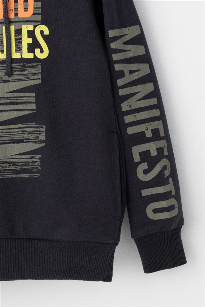 Толстовка с капюшоном для мальчика из однотонного петельчатого футера. Манжеты и пояс из эластичного трикотажа в рубчик. Спереди принт.