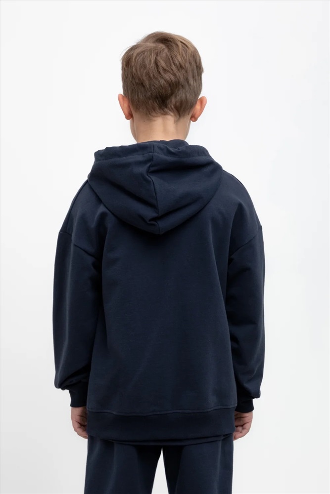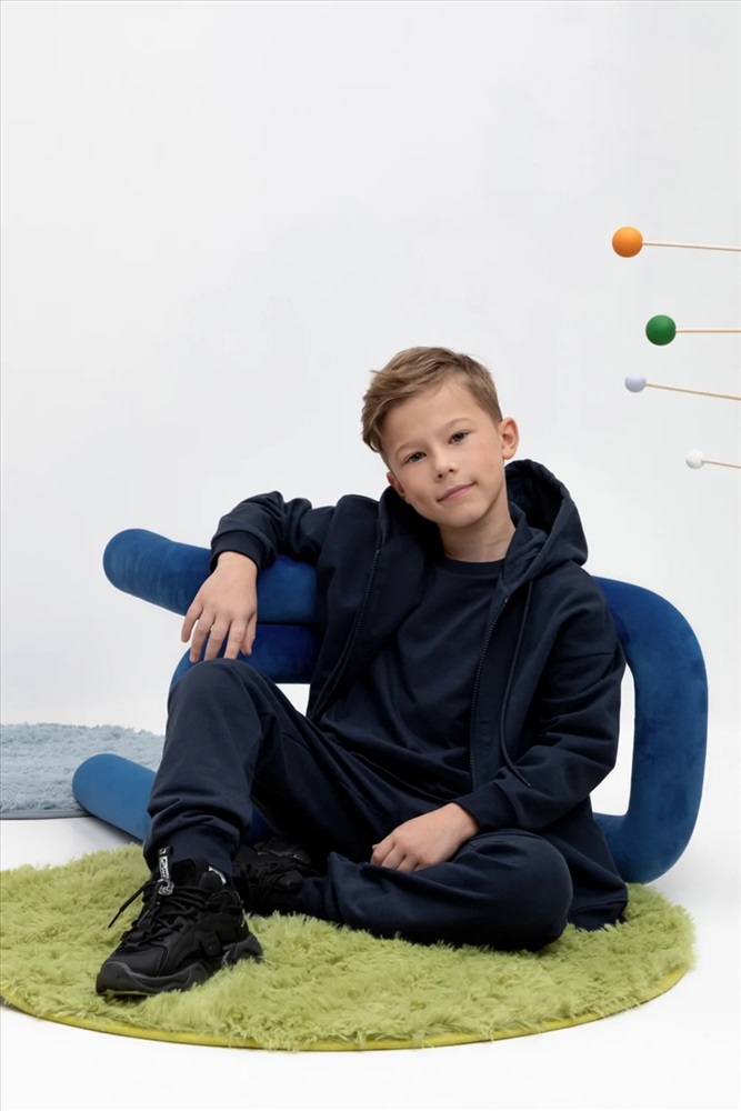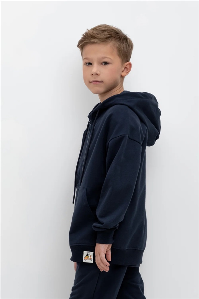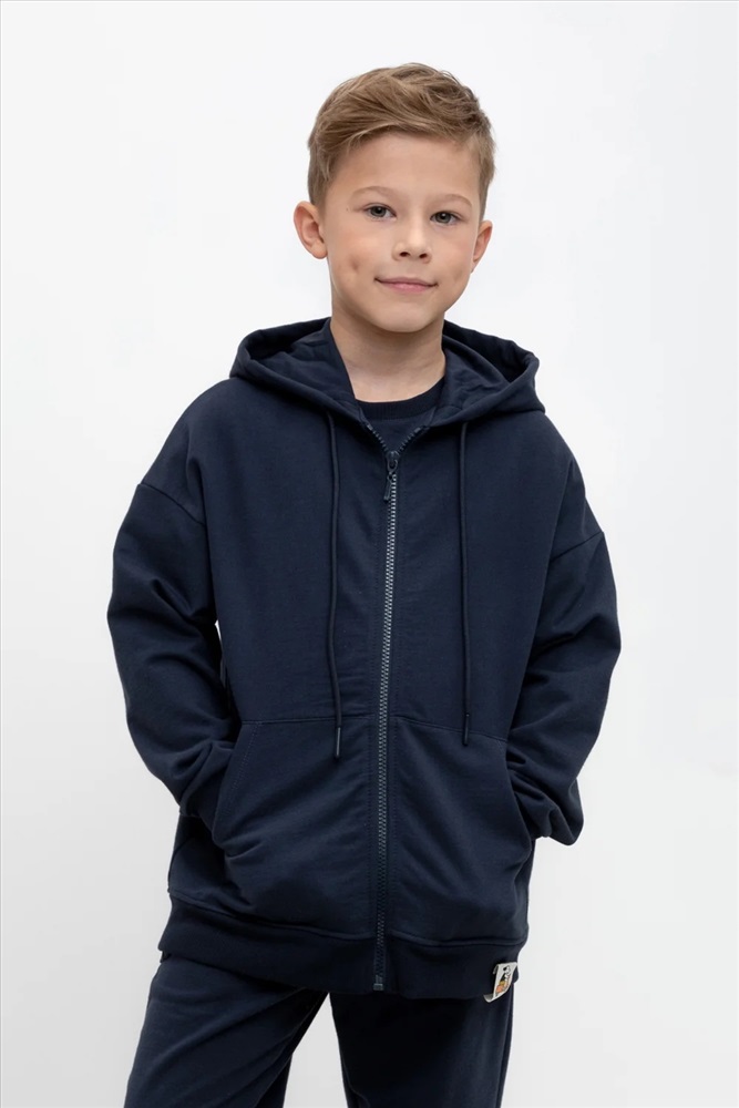 Трикотажная куртка для мальчика из петельчатого футера. Спереди удобные карманы. Манжеты и пояс из эластичного трикотажа в рубчик.