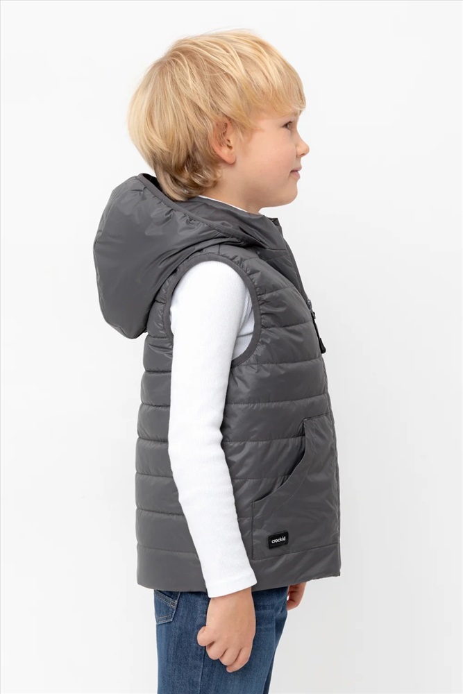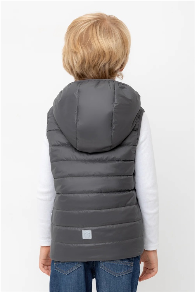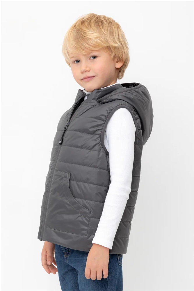 Стеганый жилет с капюшоном для мальчика с утеплителем Fellex®: 120 г/м2. Выполнен из мембранной ткани с дополнительной тефлоновой обработкой. Данный вид обработки предохраняет изделие от загрязнения и лучше отводит влагу. Подклад: 60% хлопок и 40% полиэстер на размерах 86-92 и 92-98 и 100% полиэстер на остальных размерах. У изделия предусмотрена защита подбородка. Спереди два кармана. Во всех изделиях верхнего ассортимента для безопасности ребенка предусмотрены светоотражающие элементы.