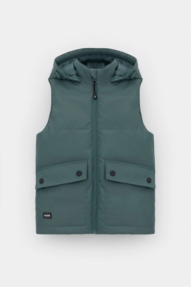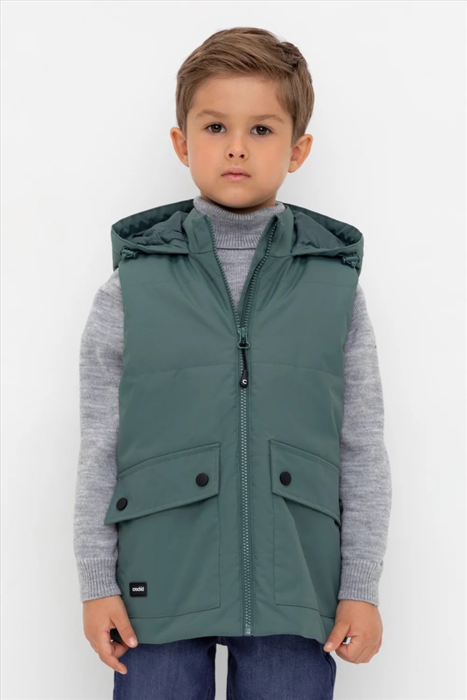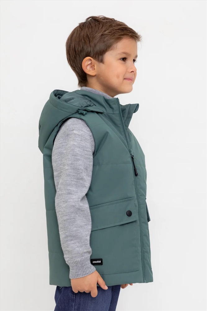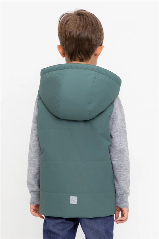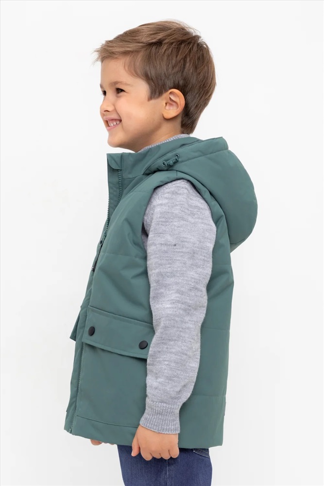 Стеганый жилет с капюшоном для мальчика с утеплителем Fellex®: 120 г/м2. Выполнен из мембранной ткани с дополнительной тефлоновой обработкой. Данный вид обработки предохраняет изделие от загрязнения и лучше отводит влагу. Подклад из 100% полиэстра. У изделия предусмотрена защита подбородка. Капюшон утягивается при помощи эластичного шнура со стопперами. Накладные карманы с клапанами на кнопках. Во всех изделиях верхнего ассортимента для безопасности ребенка предусмотрены светоотражающие элементы.