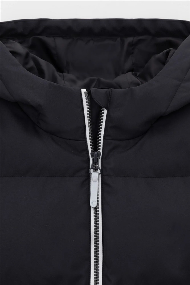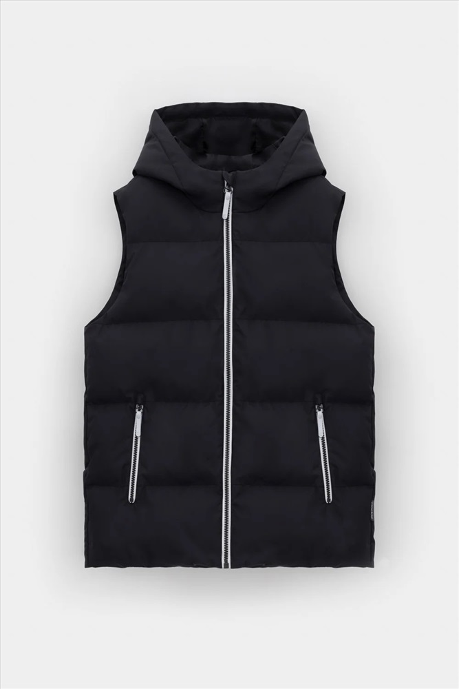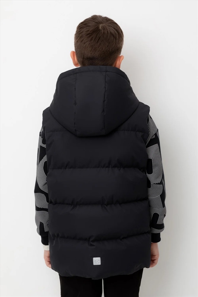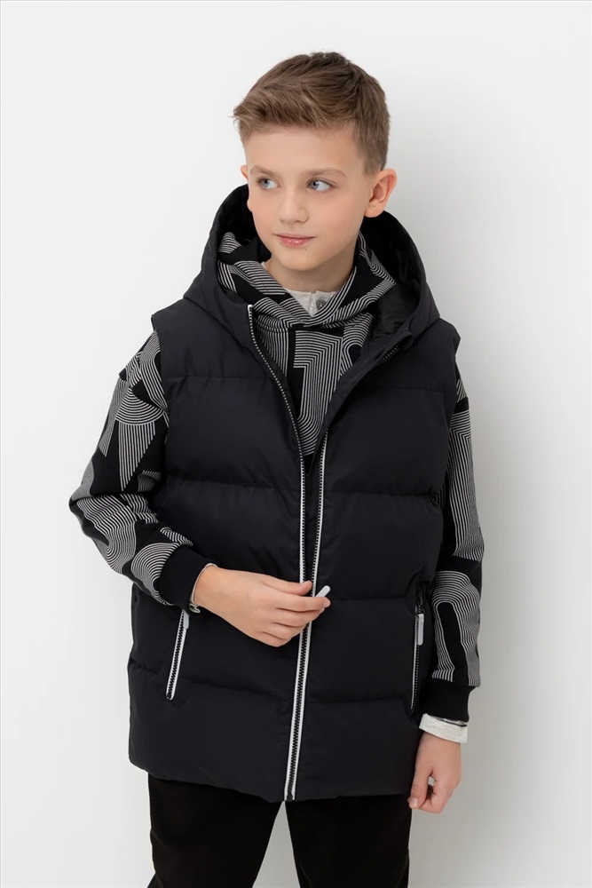 Стеганый жилет с капюшоном для мальчика с утеплителем Fellex®: 120 г/м2. Выполнен из мембранной ткани с дополнительной тефлоновой обработкой. Данный вид обработки предохраняет изделие от загрязнения и лучше отводит влагу. Подклад из 100% полиэстра. Капюшон не снимается. Изделие застёгивается на молнию, предусмотрена защита подбородка. Два кармана по бокам застёгиваются на молнии. Во всех изделиях верхнего ассортимента для безопасности ребенка предусмотрены светоотражающие элементы.