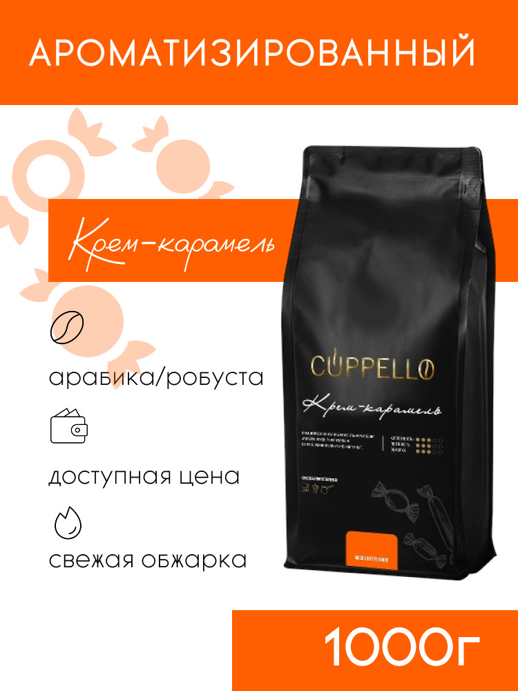 Насыщенный купаж кофе из Бразилии и Уганды в сочетании с чарующим ароматом свежей, густой карамели. Плотный, насыщенный вкус и нежный аромат.
