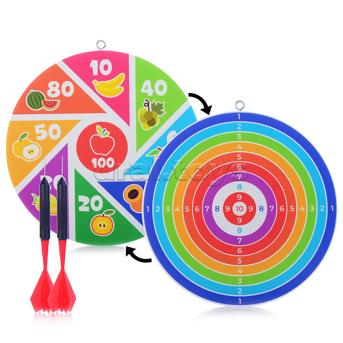 Преимущества MEGA TOYS: - плотная износостойкая пена - 7 видов двухсторонней мишени дартса - 14 вариантов дизайна - удобные дротики с острой иглой - металлическая петелька для крепления