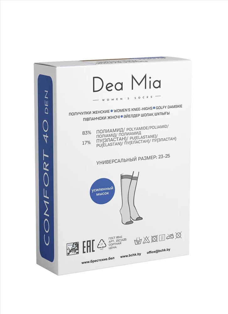 Производитель: DEA MIA; Артикул поставщика: COMFORT 20; Состав: ПА, ПА 83%, ПУ (ЭЛАСТАН), ПУ (ЕЛАСТАН) 17%; Год: 2021; Страна: Беларусь; Российский размер: 23, 25