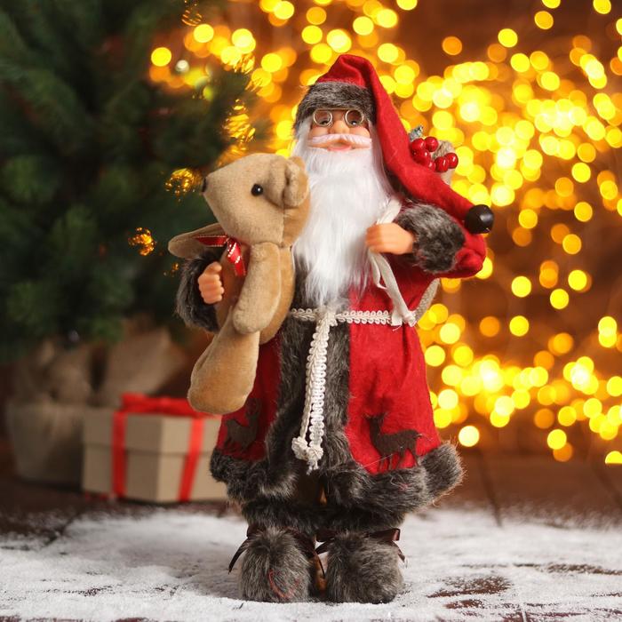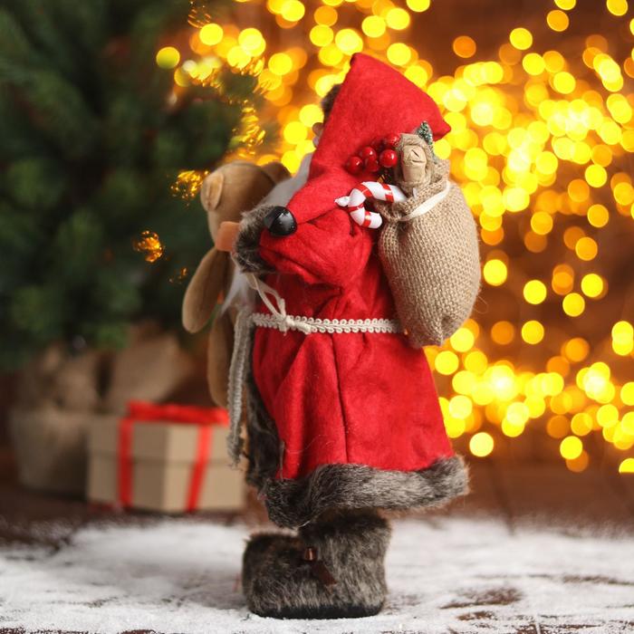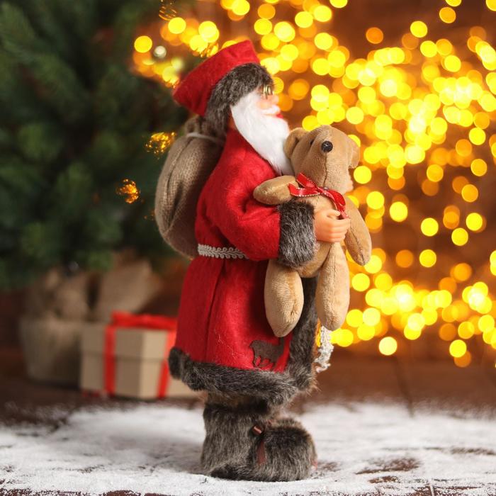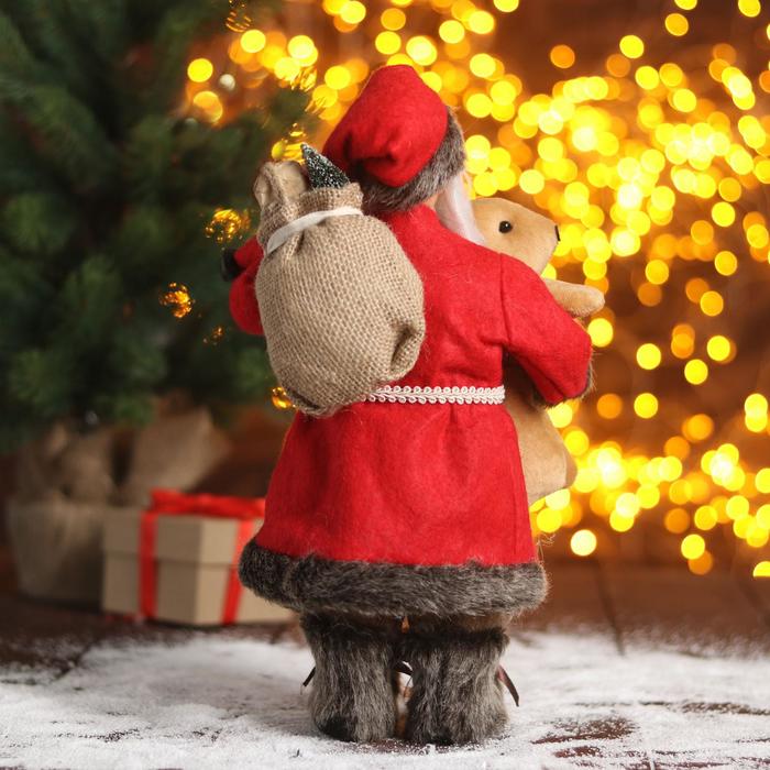 Дед Мороз в красной шубке с мишкой станет милым акцентом среди праздничного декора. Этот персонаж органично дополнит пространство под ёлкой, на полке или в фотозоне.