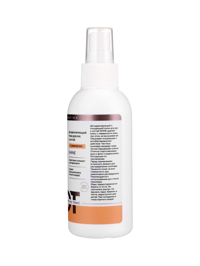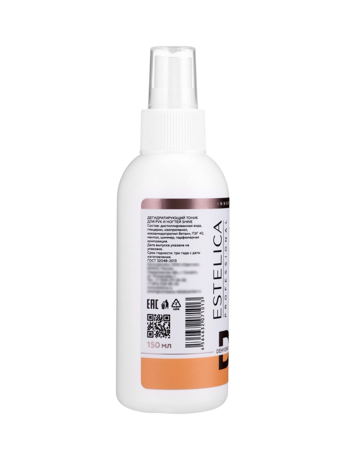 Габариты: 15 x 4,7 x 4,7 Доставка: Платная Страна: Россия В боксе: 16 шт Состав: См. на упаковке Материалы: см. на упаковке Фасовка: по 1 шт Индивидуальная упаковка: Без упаковки Сертификат: ЕАС Вес, г/Объём, мл: 150 Объём, мл: 150 Темпер. ограничение НЕ НИЖЕ ℃: 0 ESTELICA PROFESSIONAL SHINE, дегидратирующий и очищающий тоник для рук и ногтей 150 мл (спрей) — средство для эффективного удаления влаги с поверхности кожи без пересушивания, оказывающее мягкое очищающее и антибактериальное действие. Мелкие частицы шиммера придают коже лёгкое мерцающее сияние, создавая эффект здорового сияния, и делают средство идеальным для подготовки рук к фото- и видеосъёмке. Рекомендуется использовать до и после маникюра. Способ применения: перед использованием встряхнуть флакон для равномерного распределения шиммера. Распылить тоник на кожу рук и ногтей и равномерно распределить. Меры предосторожности: хранить в местах, недоступных детям, вдали от огня. Не принимать внутрь и избегать вдыхания паров. При попадании в глаза промыть водой. Состав: изопропанол, кокоамидопропил бетаин, ПЭГ-40, глицерин, дистиллированная вода, ментол, шиммер, парфюмерная композиция. Комментарии к товару