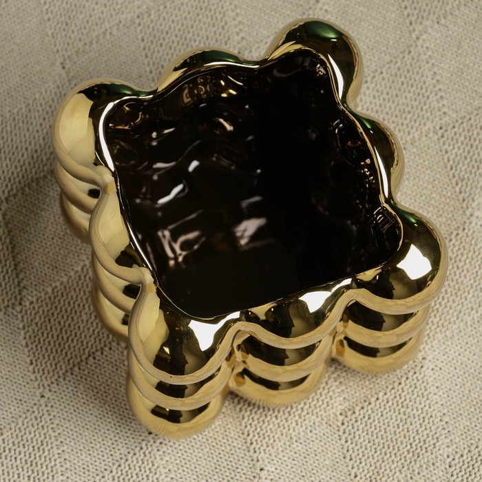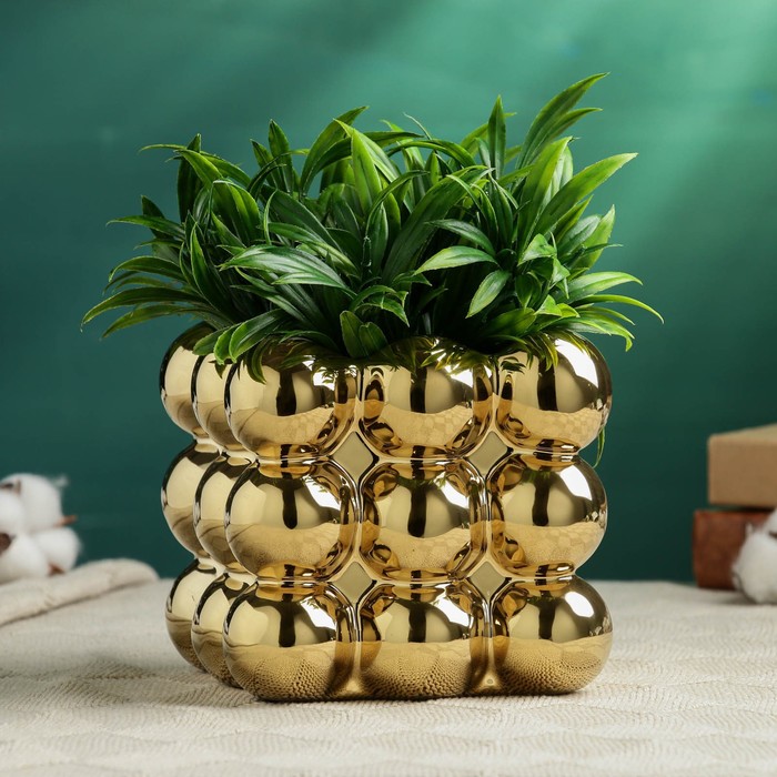 Декоративное золотистое кашпо «Люмьер» — изысканный элемент интерьера, который станет стильным акцентом в любом помещении. Его компактные размеры 13×13 см и ёмкость 1,1 литра делают его идеальным выбором для размещения на столах, подоконниках или полках.