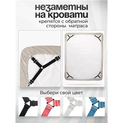 кто стремится создать максимально комфортные условия для сна. Используя фиксатор для простыни, удается создать ровную поверхность для сна, исключая складки и сдвиги простыни во время отдыха. Подтяжки прищепки надежно фиксируют ее края, препятствуя сбиванию. Это обеспечивает комфортный отдых для каждого. Держатели для простыни представлены в виде зажимов с резинками. Металлический зажим для простыни с пластиковой вставкой соединен при помощи резинки, что позволяет удобно растянуть такой держатель на любую ширину матраса. Благодаря эластичности резинок, удается без труда регулировать длину до 40 см в одну сторону, тем самым используя фиксатор простыни для любой кровати или диване в спальне. Это настоящая находка для тех, кто стремится к удобству во время сна. Подтяжки универсальны, они подойдут для кровати, дивана, для скатерти на столе, для фиксации чехла на кресло, гладильную доску и т.д. Резинка позволяет надеть любые постельные принадлежности - простынь или наматрасник на кровать любой величины, диван, будь это односпальный или двухспальный матрас. Удобно закрепить на резинке, непромокаемую или одноразовую простынь или детскую простынку в круглой овальной кроватке или домике, зафиксировать креплениям клипсы кронштейна одеяла, скатерть, чехол или покрывало на диван.
