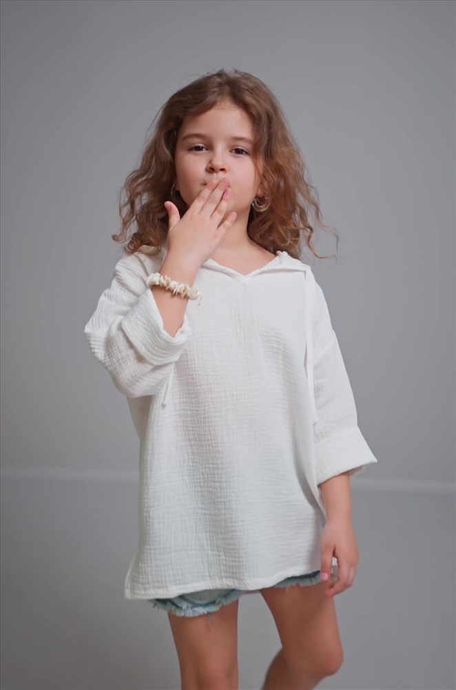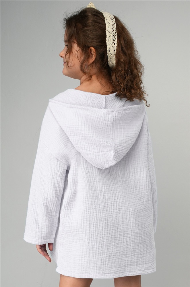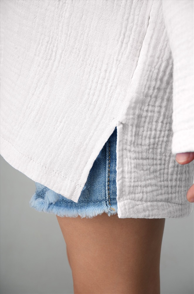 100% хлопок дарит невероятную мягкость и воздушность. Муслиновая туника отлично пропускает воздух и быстро сохнет. Лето с ней — это лёгкость в каждом движении. Крой оверсайз, спущенная линия плеча и капюшон на завязках делают удлиненную тунику стильной и удобной. Разрезы по бокам добавляют свободы, а длинный рукав защищает от солнца и лёгкого ветерка. В длинной тунике так легко превратиться в настоящего исследователя пляжа или строителя песчаных замков. Хлопковая туника из муслина подойдёт для летних дней. Модель Маша, ее рост 128, параметры: 64-59-72. На ней размер 128.