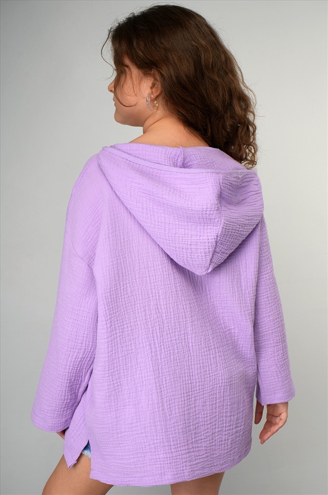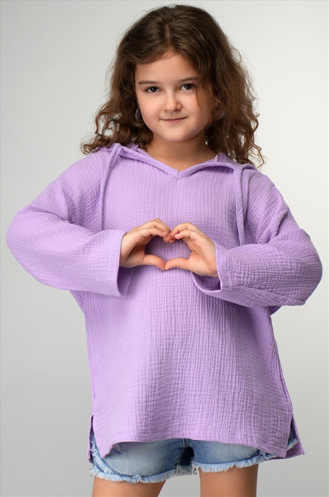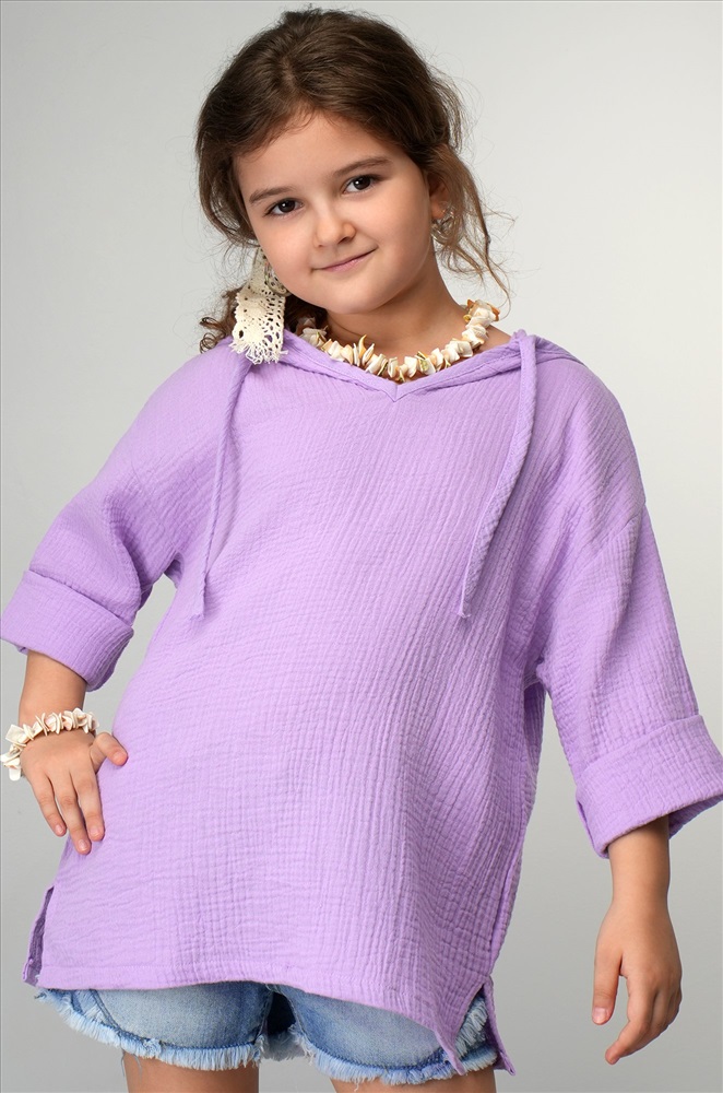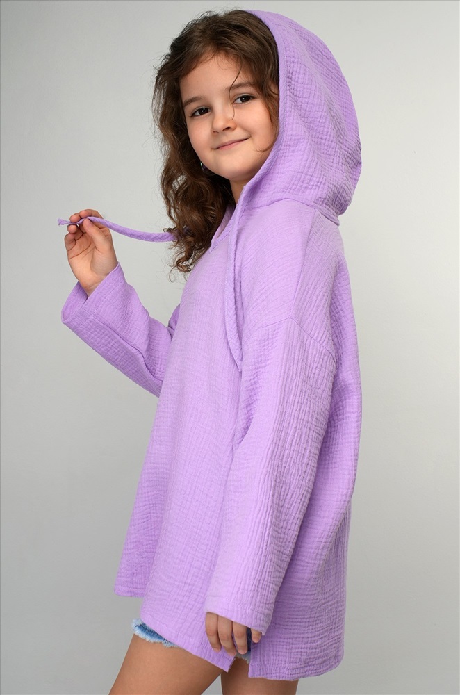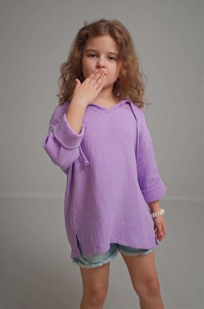 100% хлопок дарит невероятную мягкость и воздушность. Муслиновая туника отлично пропускает воздух и быстро сохнет. Лето с ней — это лёгкость в каждом движении. Крой оверсайз, спущенная линия плеча и капюшон на завязках делают удлиненную тунику стильной и удобной. Разрезы по бокам добавляют свободы, а длинный рукав защищает от солнца и лёгкого ветерка. В длинной тунике лавандового цвета так легко превратиться в настоящего исследователя пляжа или строителя песчаных замков. Хлопковая туника из муслина подойдёт для летних дней. Модель Маша, ее рост 128, параметры: 64-59-72. На ней размер 128.