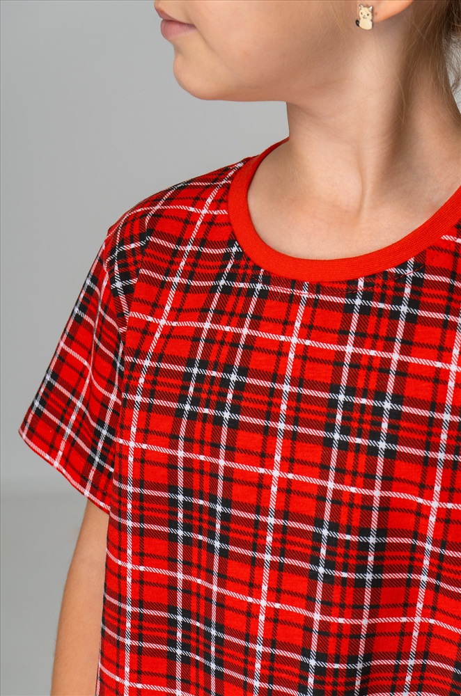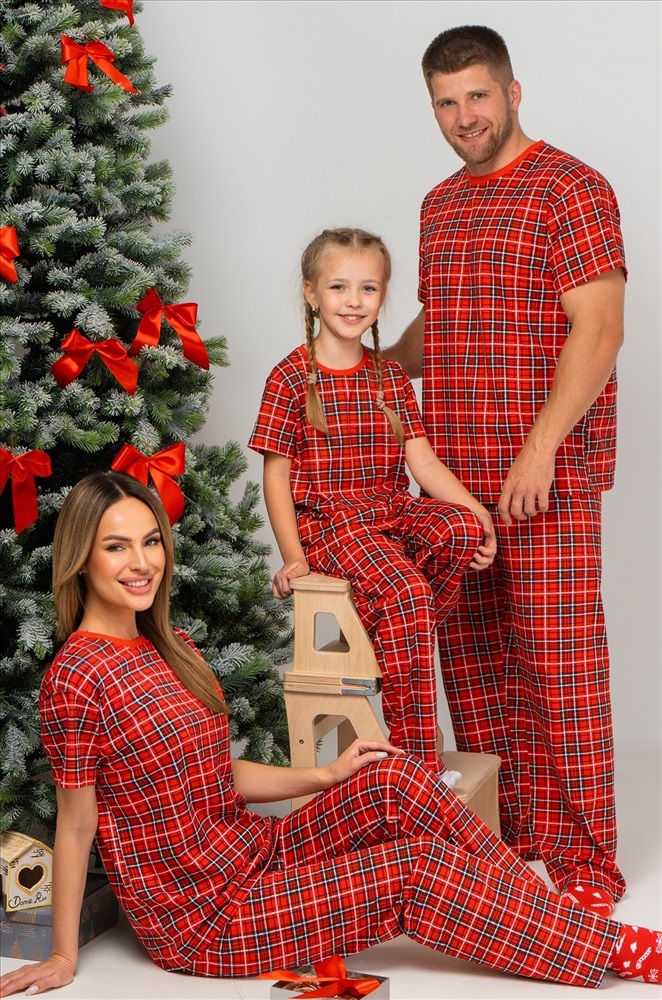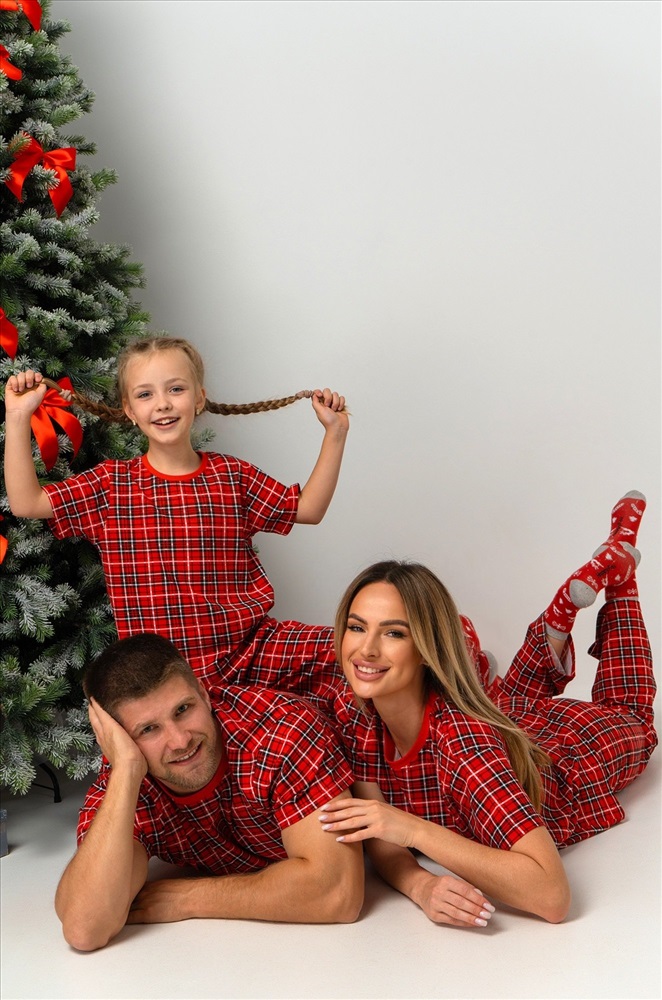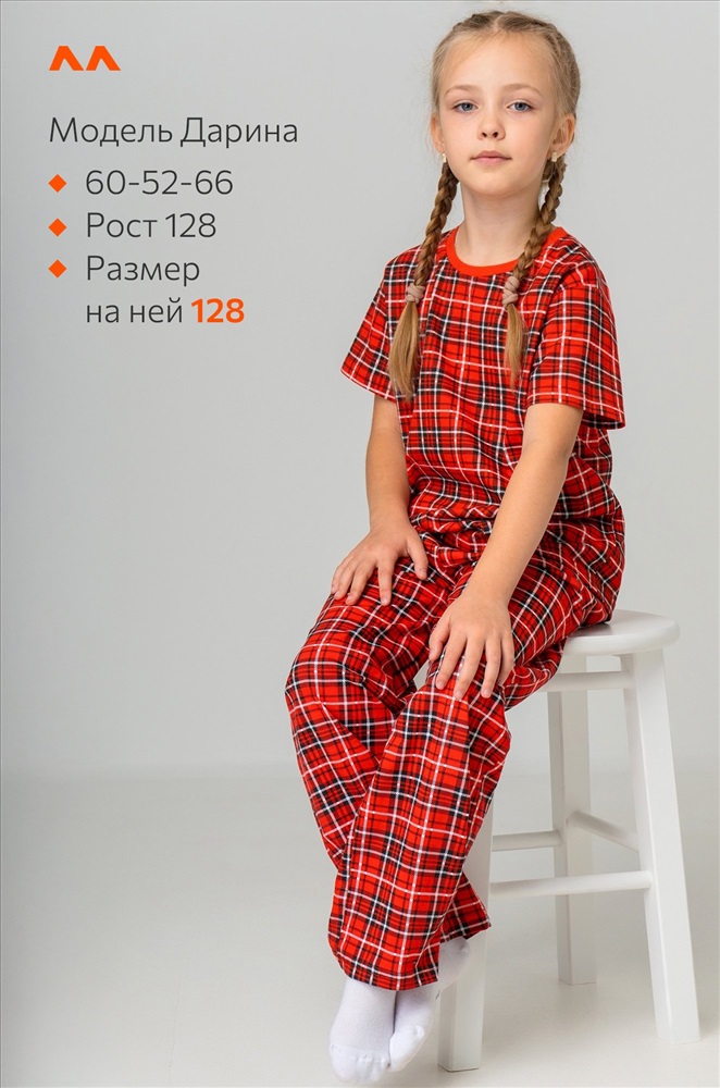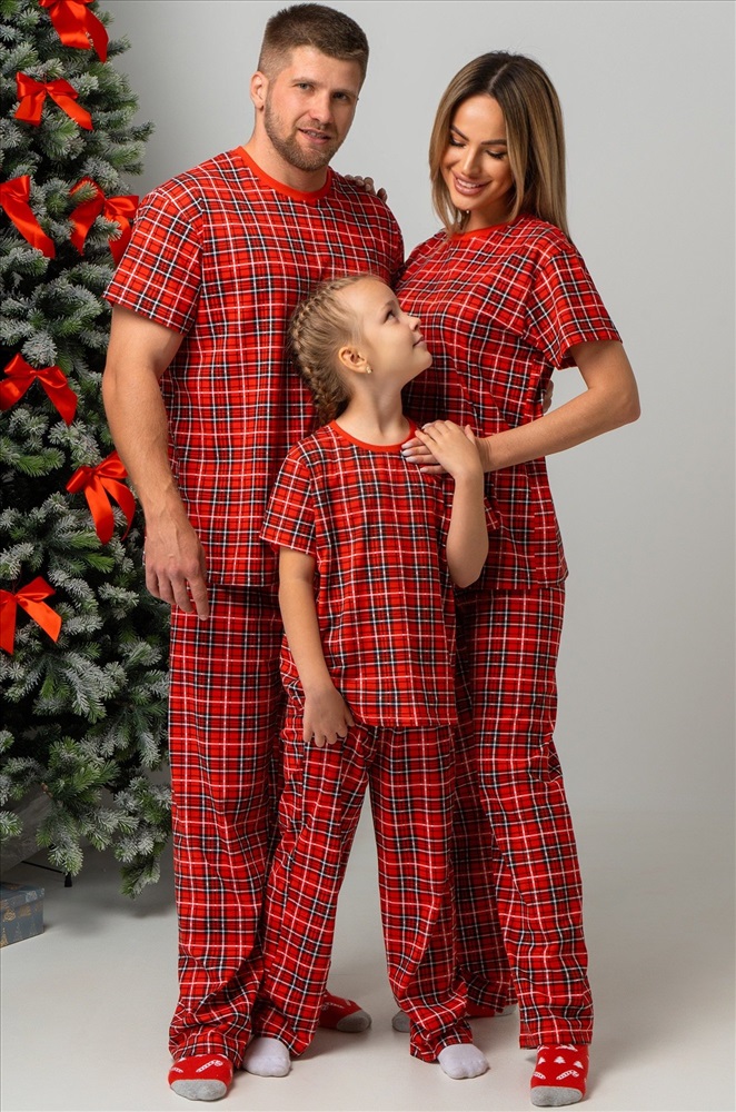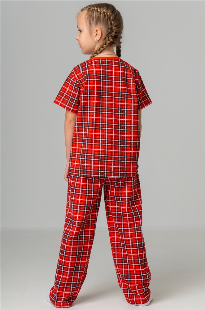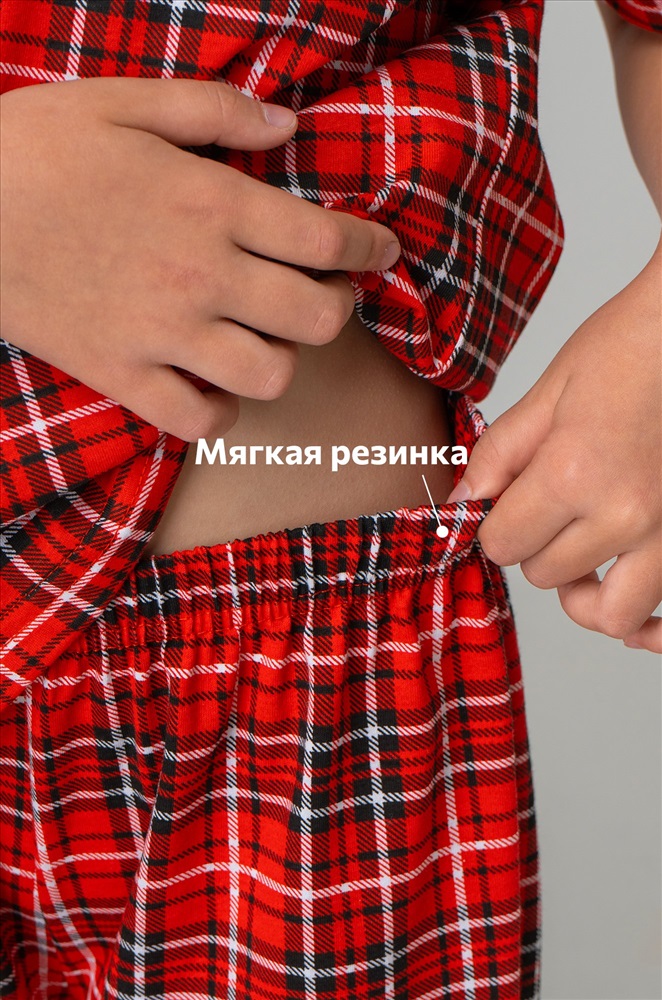 Преимущества: — 100% натуральный хлопок — мягкий, дышащий и гипоаллергенный материал; — трикотажная ткань кулирная гладь (плотность 145 г/м2) — приятна к телу и не теряет форму после множества стирок; — лёгкий комплект двойка — футболка с коротким рукавом и удобные брюки на резинке; — свободный крой — не стесняет движений, подходит для мальчиков и девочек; — стильный клетчатый рисунок и яркий красный цвет создают новогоднюю атмосферу; — отличный вариант подарка на Новый год или Рождество. Детская пижама со штанами в шотландскую клетку станет любимым домашним костюмом ребёнка. В ней приятно спать, играть и проводить уютные вечера дома или на отдыхе с семьёй. Пижама для детей и подростков станет отличным вариантом для family look с пижамой для женщин арт. HF00117 и пижамой для мужчин арт. HF00119.