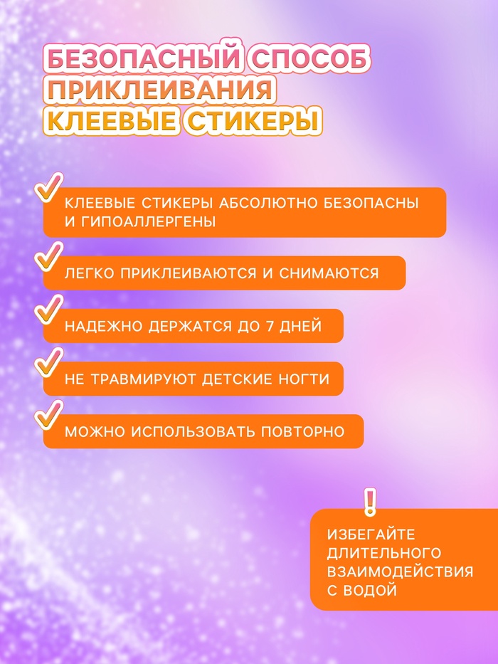 Габариты: 11 x 7 x 1 Страна: Китай В боксе: 1200 набор Состав: См. на упаковке Материалы: см. на упаковке Фасовка: по 1 набор Индивидуальная упаковка: Без упаковки Сертификат: Не подлежит сертификации Цвет: Чёрный, Розовый Детские накладные ногти – волшебство маленьких ручек! Представляем вам удивительное средство для создания неповторимого образа – детские накладные ногти! Эти яркие и безопасные аксессуары станут настоящим хитом среди маленьких модниц. Наши накладки выполнены из высококачественного гипоаллергенного материала, который абсолютно безвреден для детской кожи. Они легко крепятся и снимаются, позволяя малышкам экспериментировать со своим стилем сколько угодно раз. Разнообразие дизайнов поражает воображение: от милых зверушек и сказочных принцесс до ярких цветов и блесток. Каждый набор станет маленьким шедевром на пальчиках вашей девочки, добавляя нотки волшебства в повседневность. Накладные ногти помогут развить мелкую моторику, фантазию и чувство стиля, ведь каждая девочка мечтает быть особенной! Пусть они станут частью ее игры и творчества, создавая незабываемые моменты радости и веселья. Порадуйте свою маленькую принцессу этим замечательным подарком, который обязательно вызовет улыбку и восторг! Комментарии к товару