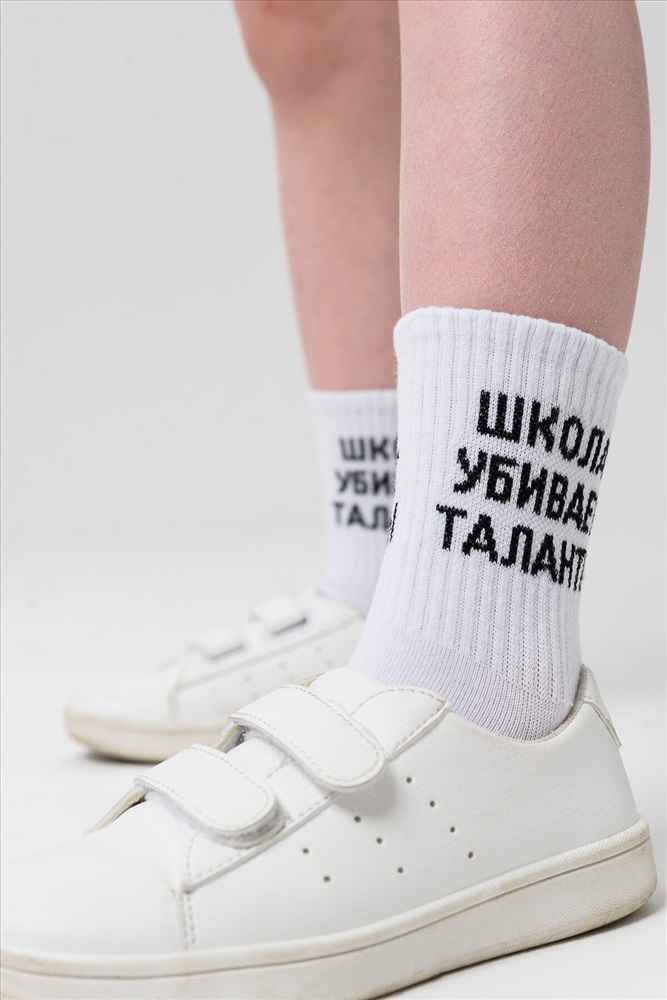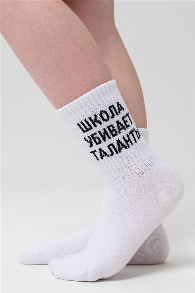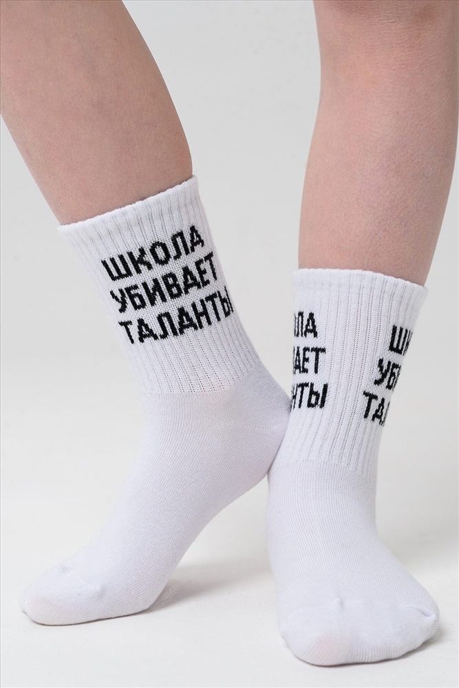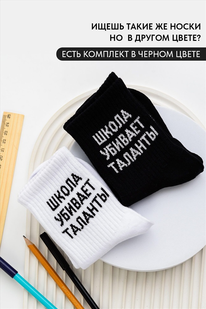ID товара: 1105416 Состав: 76% Хлопок, 22% Полиамид, 2% Эластан Сезон: Демисезон Основная ткань: Хлопок Вид носков/гольф: Фантазийные Вид ткани: Чулочно-носочный трикотаж Страна бренда: Россия Страна производства: Россия Комплект носков для детей. Широкая резинка, надпись Школа убивает таланты В комплекте 2 пары. Комментарии к товару