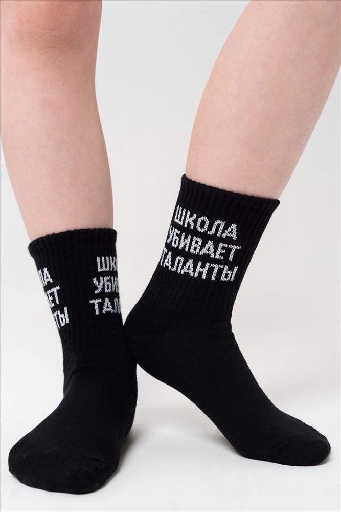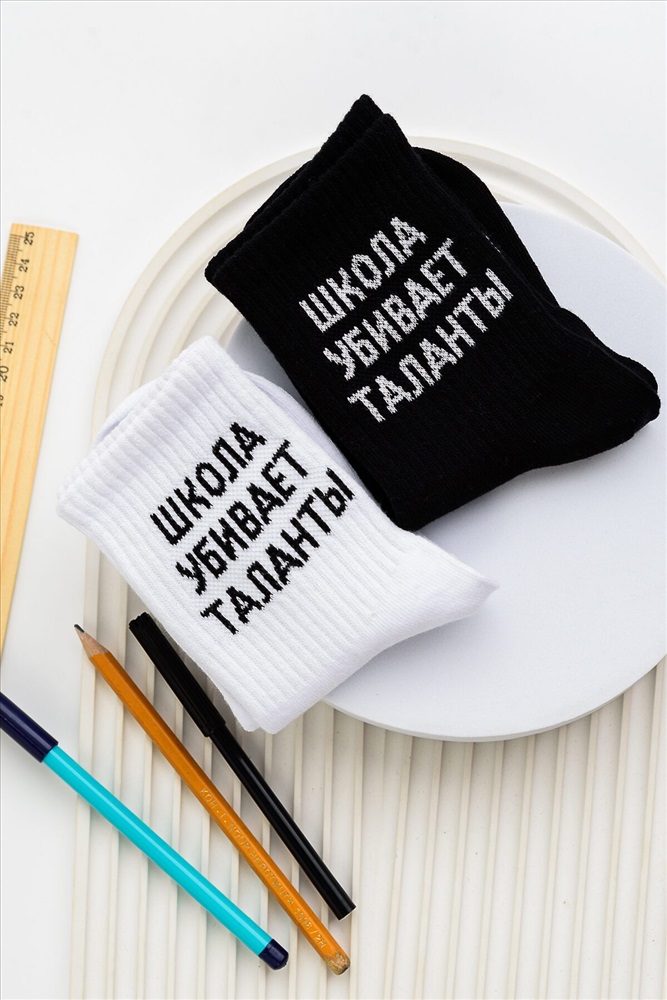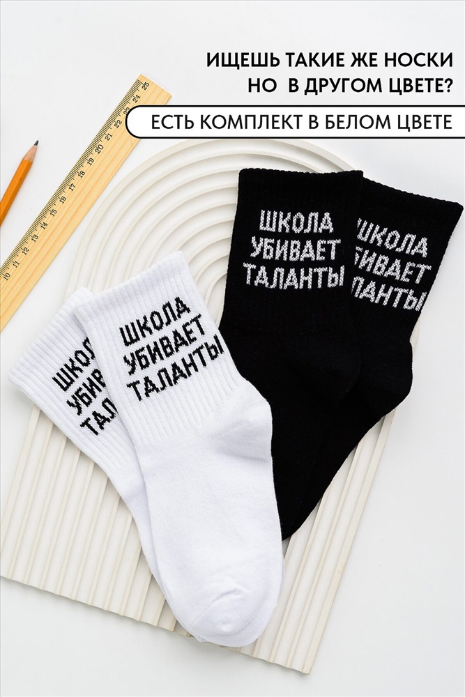 ID товара: 1105417 Состав: 76% Хлопок, 22% Полиамид, 2% Эластан Сезон: Демисезон Основная ткань: Хлопок Вид носков/гольф: Фантазийные Вид ткани: Чулочно-носочный трикотаж Страна бренда: Россия Страна производства: Россия Комплект носков для детей. Широкая резинка, надпись Школа убивает таланты В комплекте 2 пары. Комментарии к товару