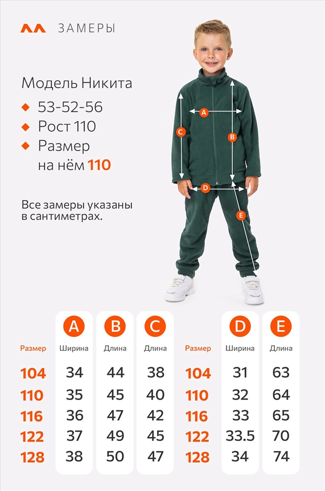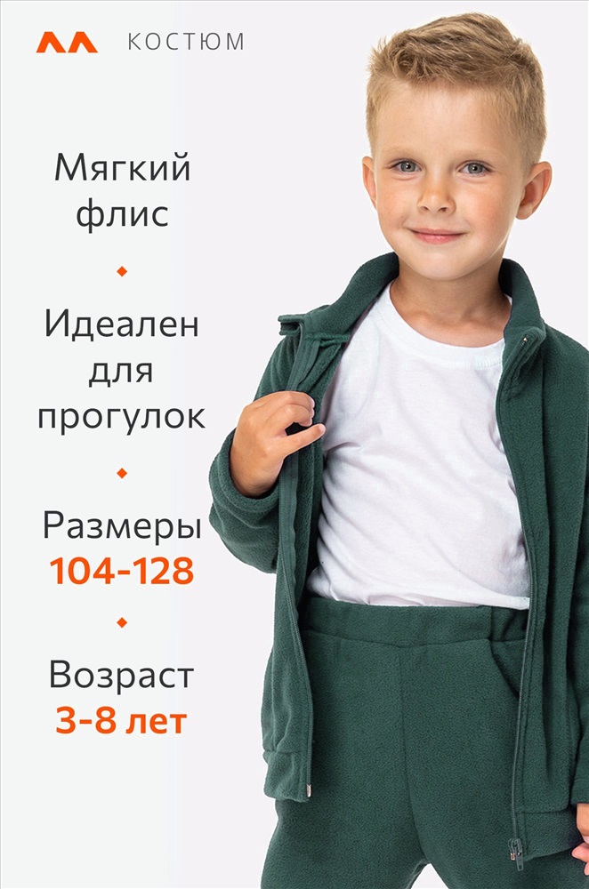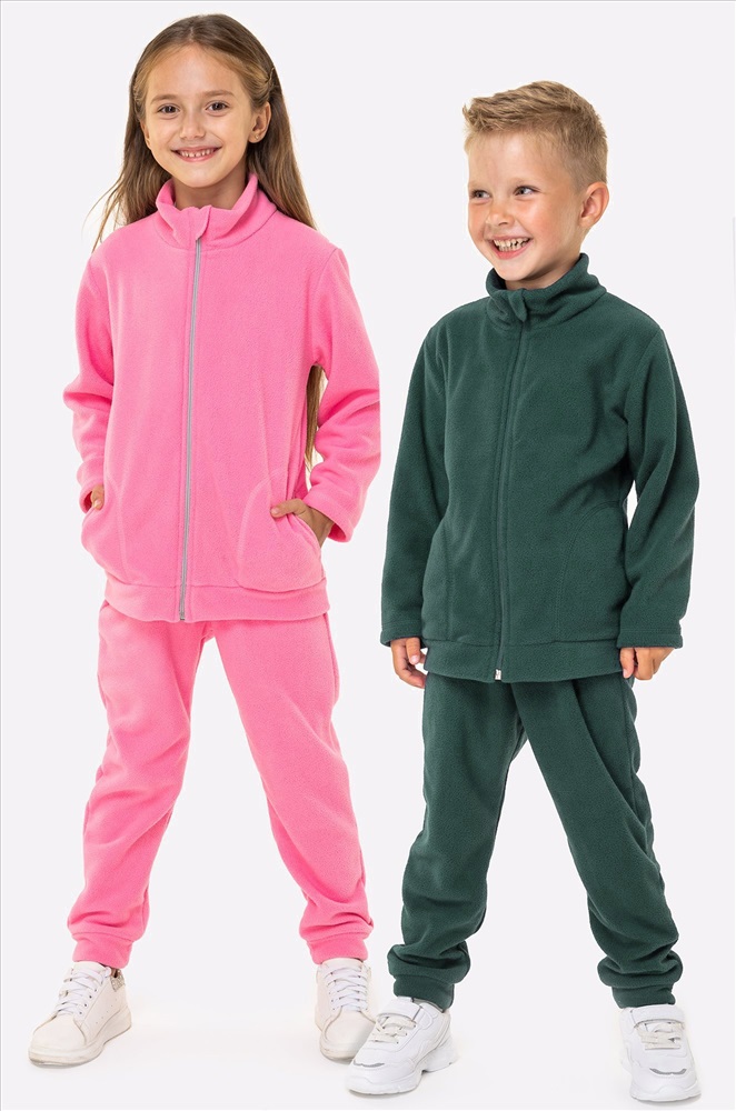 Преимущества: — зеленый костюм из флиса приятен к телу, отлично сохраняет тепло; — демисезонный детский костюм двойка идеален для прохладных дней; — костюм на молнии: ребёнок легко застёгивает её сам, при этом шея надежно закрыта от ветра и сквозняков; — имеются карманы, в которых удобно хранить мелочи или греть ручки во время прогулки; — костюм со штанами имеет комфортную посадку, благодаря манжетам штанины не сползают и не задираются во время активных игр; — практичный спортивный костюм из флиса: ткань быстро сохнет, легко стирается, не мнётся и не линяет. — тёплый зимний костюм подходит для холодной осени, зимы и межсезонья, его можно носить самостоятельно или использовать как поддеву. Флисовый костюм для детей – это универсальное решение для прогулок и игр весенними и осенними днями. Девочка, рост модели 126, параметры: объем груди 56, объем талии 52, объем бедер 62. На ней размер 128. Мальчик, рост модели 110 см. На нем размер 110.