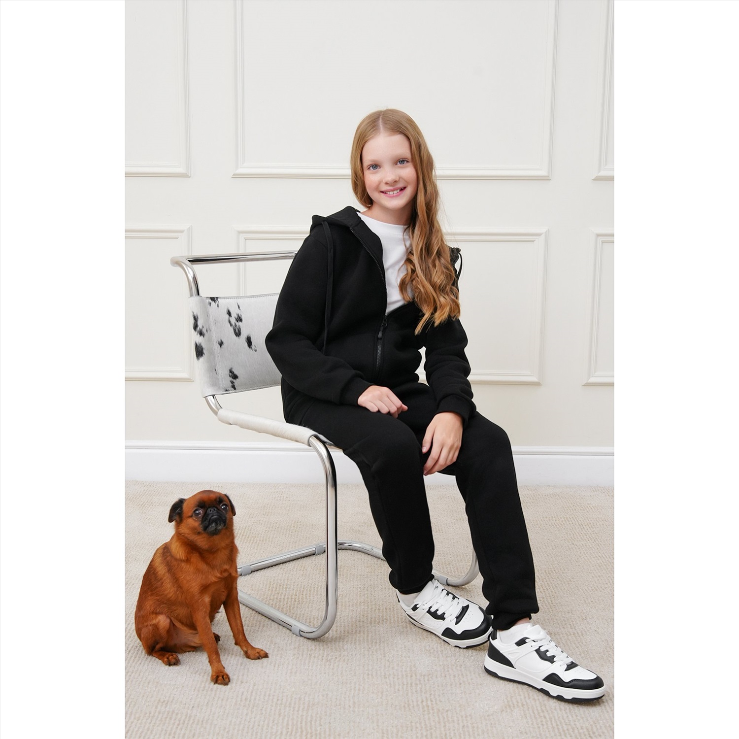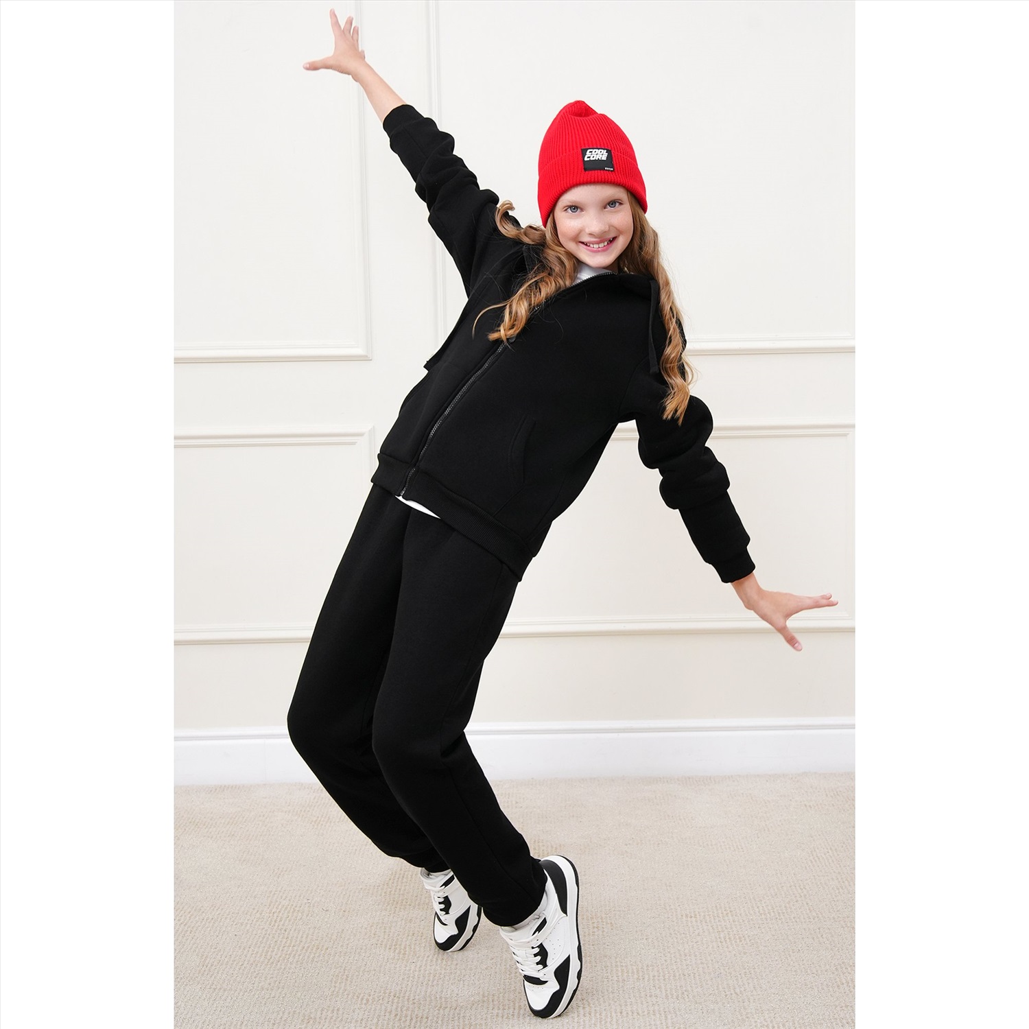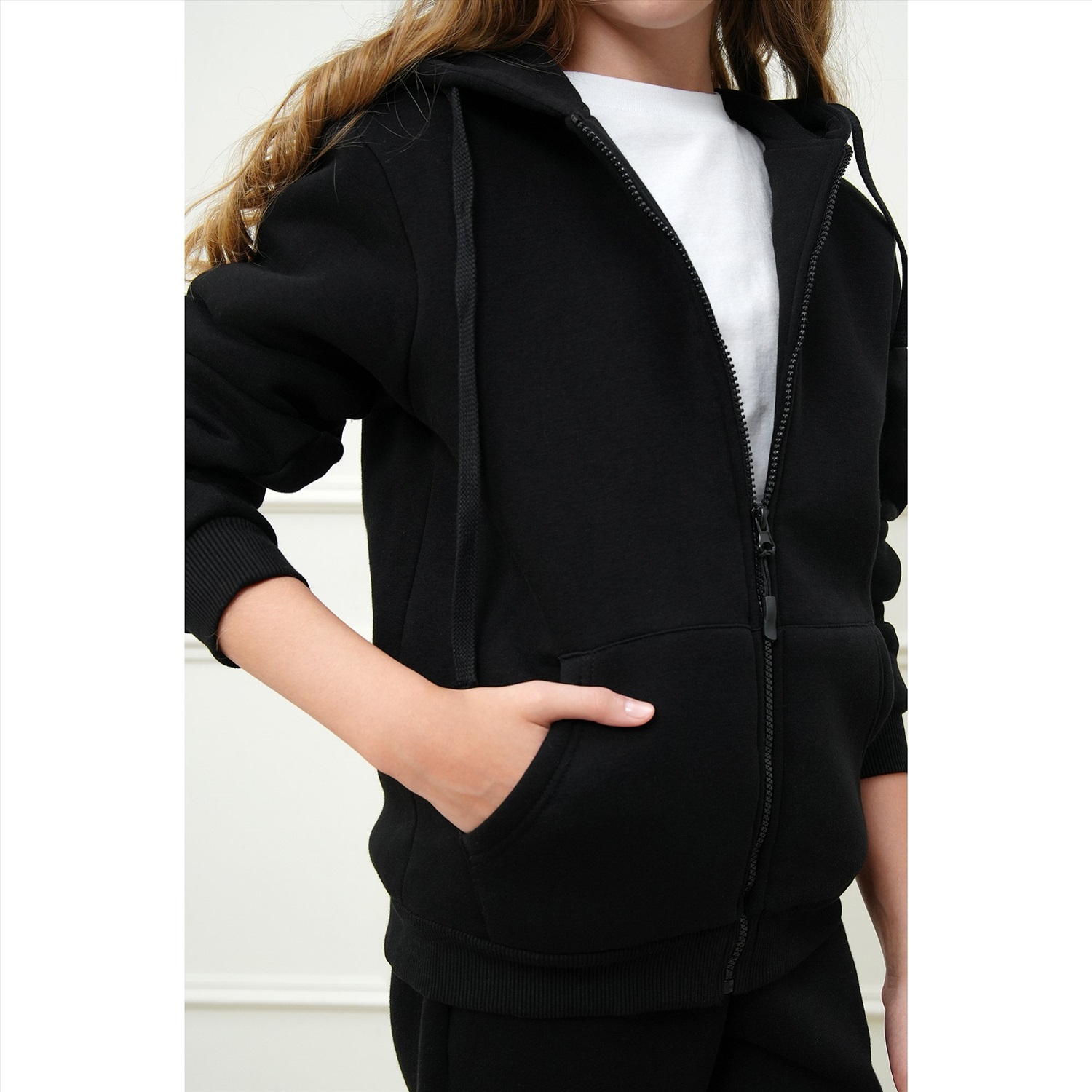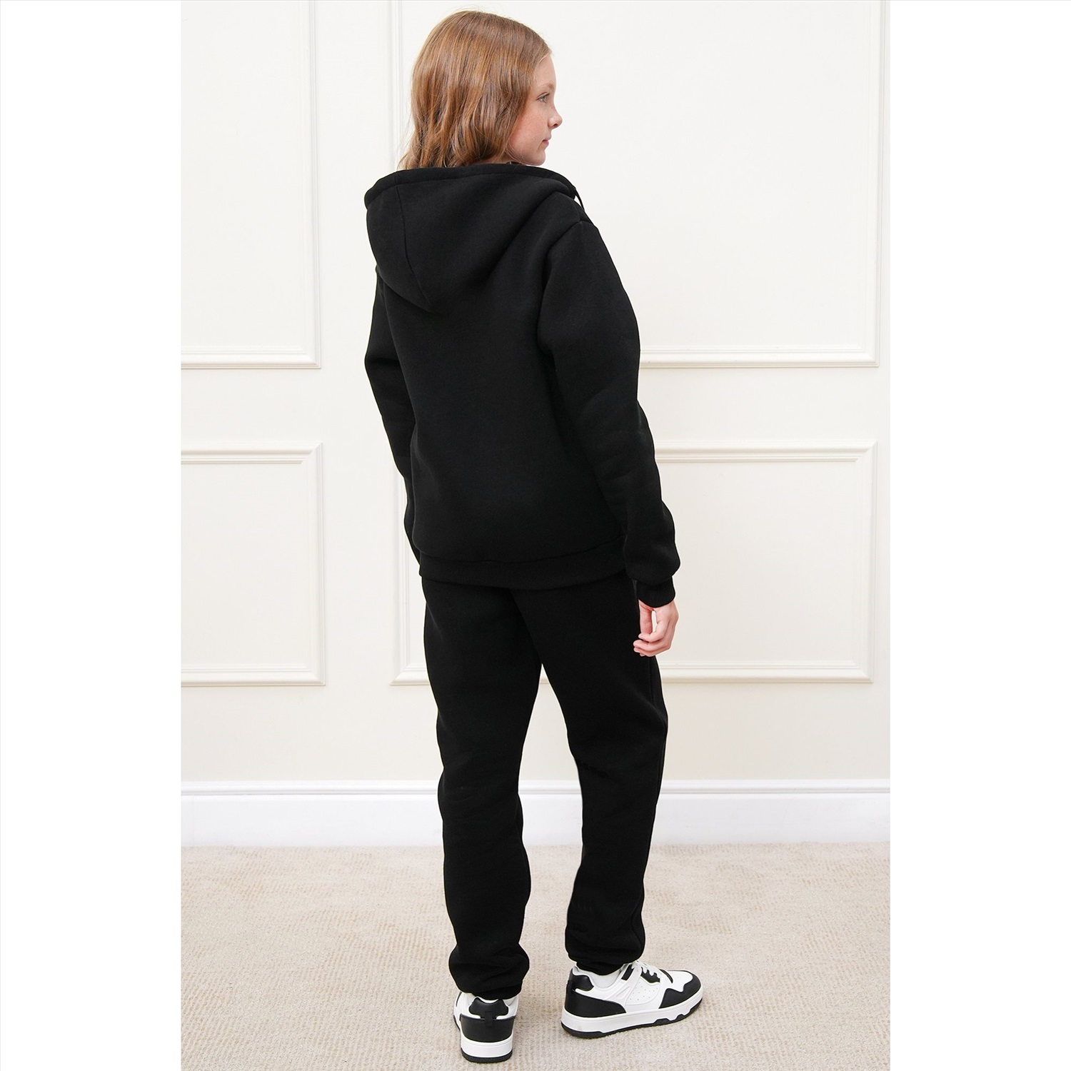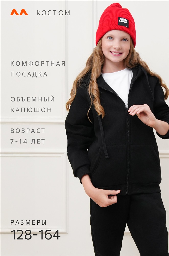 Детский костюм с худи и брюками для мальчиков и девочек выполнен из плотного трикотажа футер с начесом. Базовый черный цвет делает комплект для подростков универсальным и легко вписывается в повседневные образы.