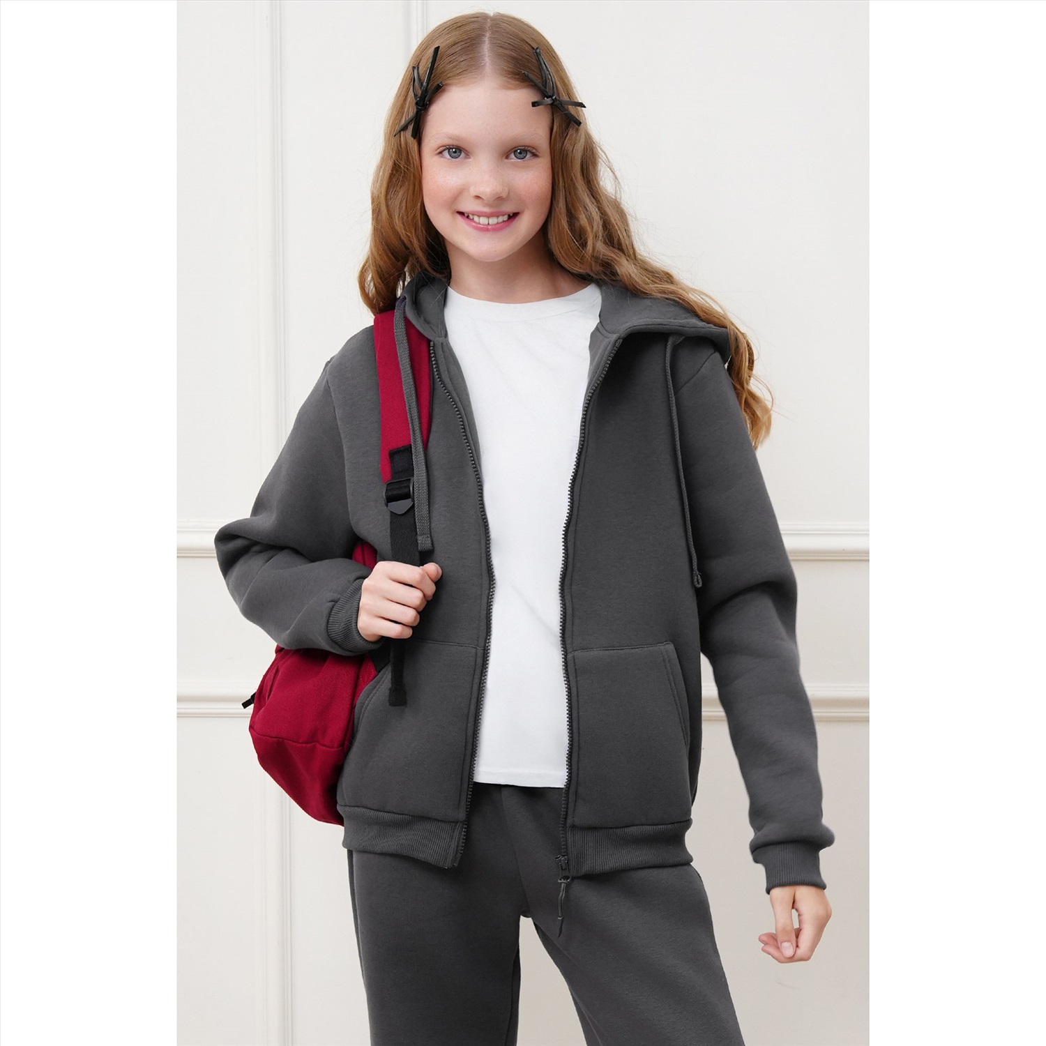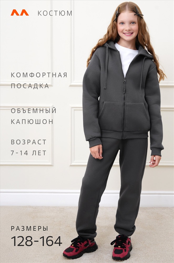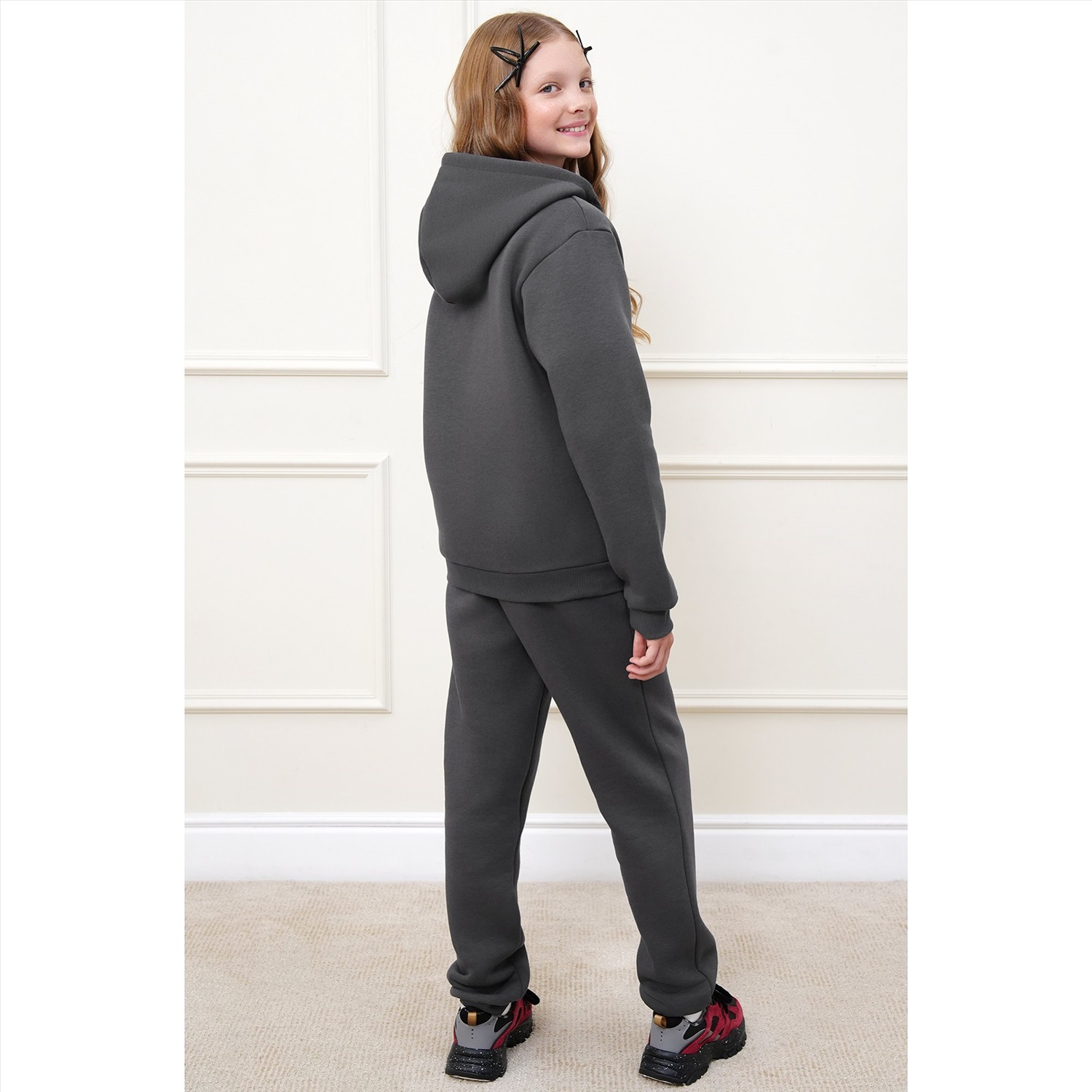 Детский костюм с худи и брюками для мальчиков и девочек выполнен из плотного трикотажа футер с начесом. Базовый темно-серый цвет делает комплект для подростков универсальным и легко вписывается в повседневные образы.