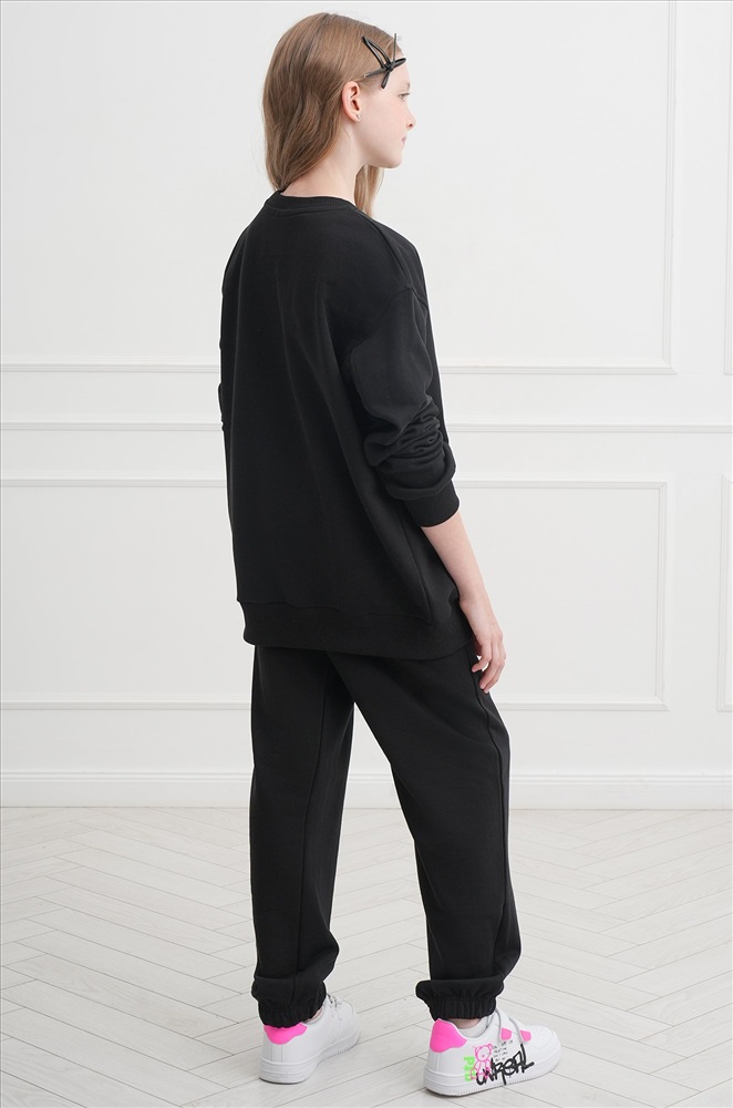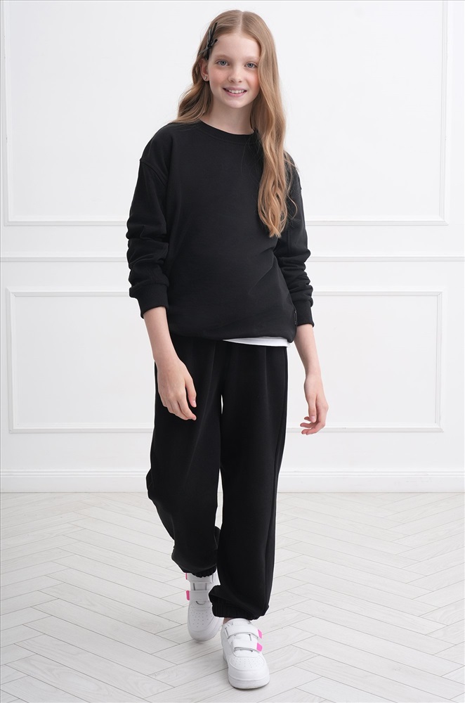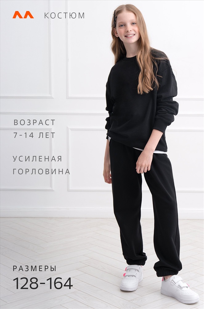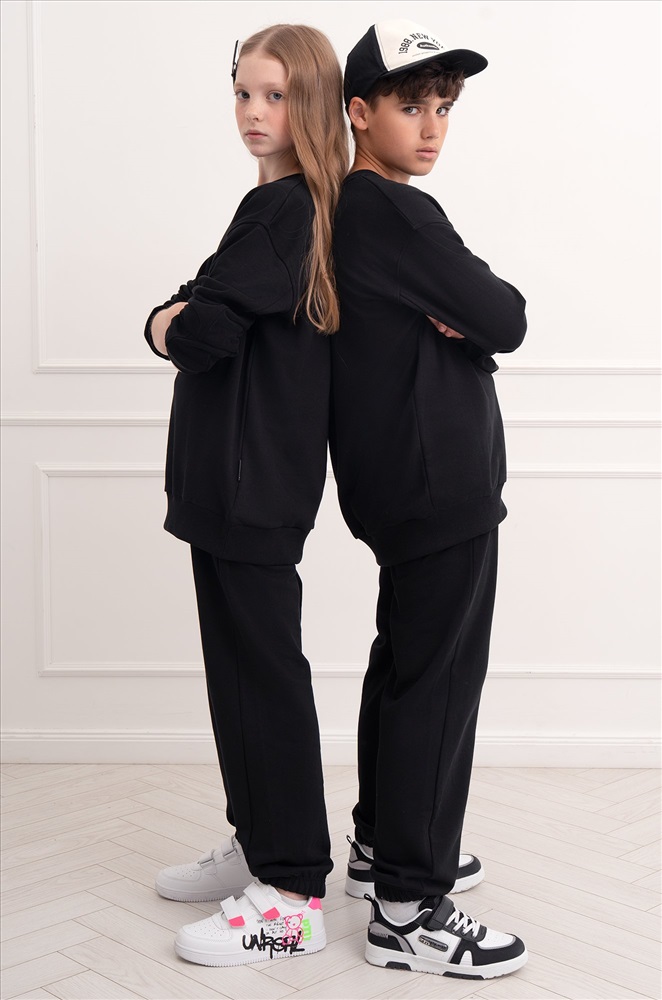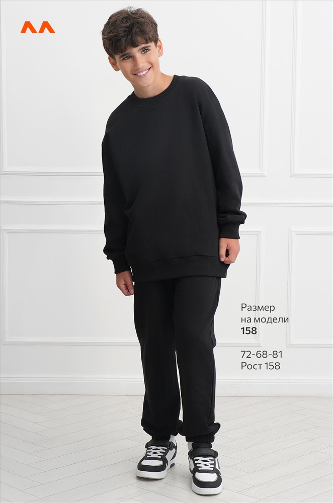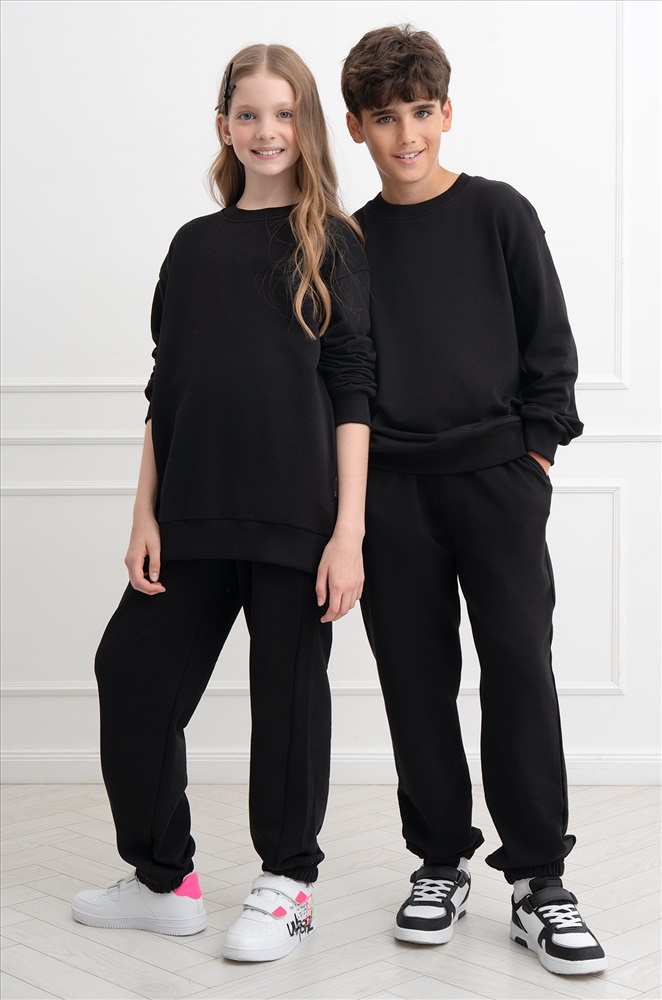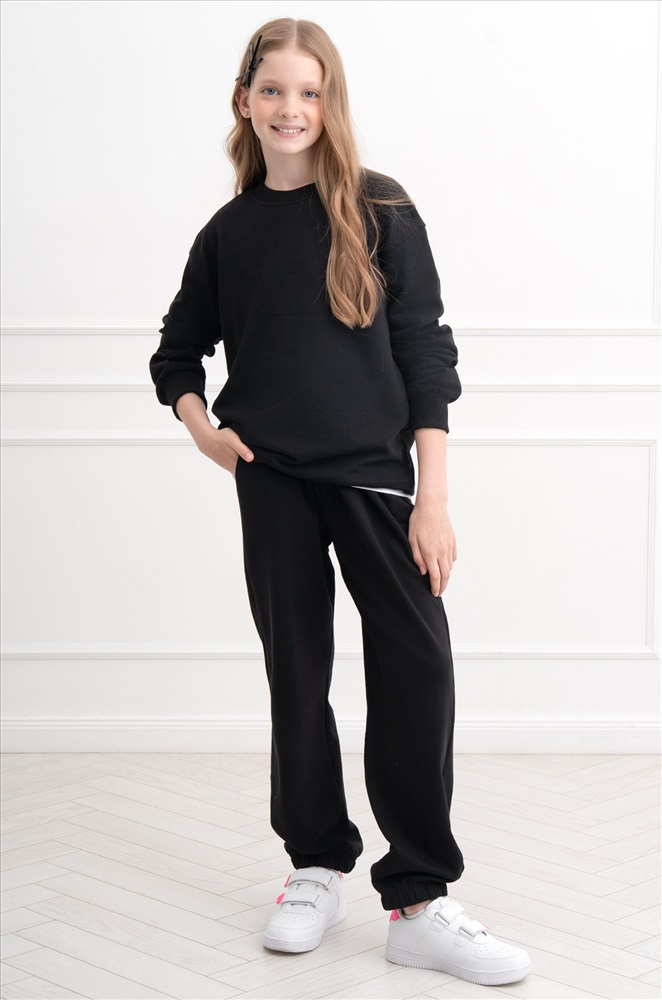Демисезонный трикотажный костюм оверсайз для подростков пригодится на каждый день. Насыщенный черный цвет и свободный крой делают его идеальным выбором для мальчика и для девочки.