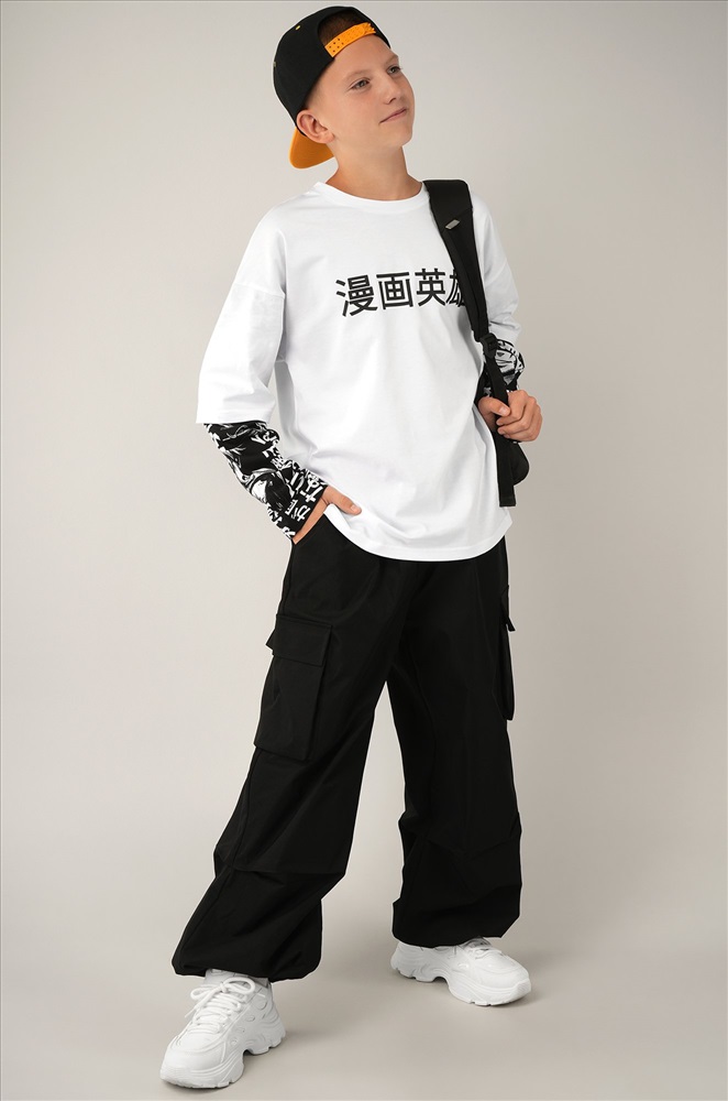 Белый лонгслив с принтом в стиле аниме для мальчиков и мальчиков подростков — выбор для тех, кто ценит свободу и уличную эстетику.