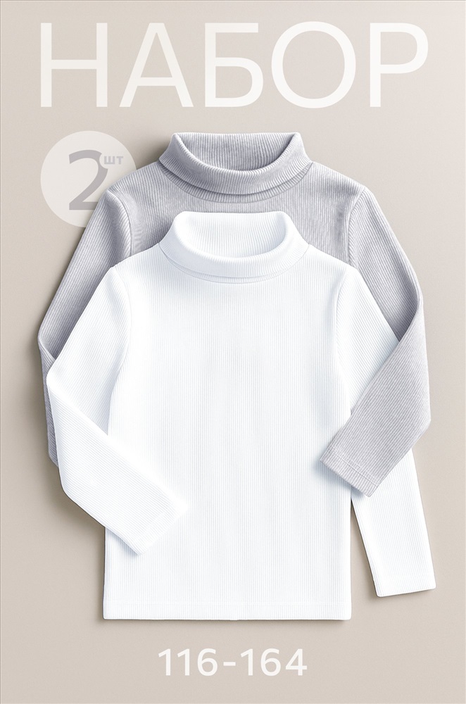 Преимущества: — натуральный хлопок с эластаном — мягкость, комфорт и долговечность; — фактурный трикотаж кашкорсе — приятная посадка по фигуре; — в наборе сразу 2 водолазки — практичное решение для повседневных образов; — прямой крой и длинные рукава — свобода движений на весь день; — высокий воротник-стойка защищает от холода и смотрится стильно; — белый и серый цвета подойдут и девочкам, и мальчикам; — детский бадлон универсален: подойдет для школы и для прогулок. Однотонная водолазка легко впишется в школьный гардероб. Базовая водолазка хорошо сочетается с любым низом и подойдет для многослойных образов. Модель Даша, ее рост 150 см, параметры 70-60-73 см. На ней размер 152. Модель Марк, его рост 157 см, параметры 75-72-87 см. На нем размер 158.