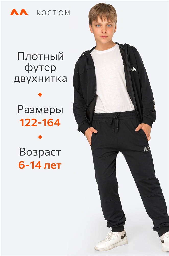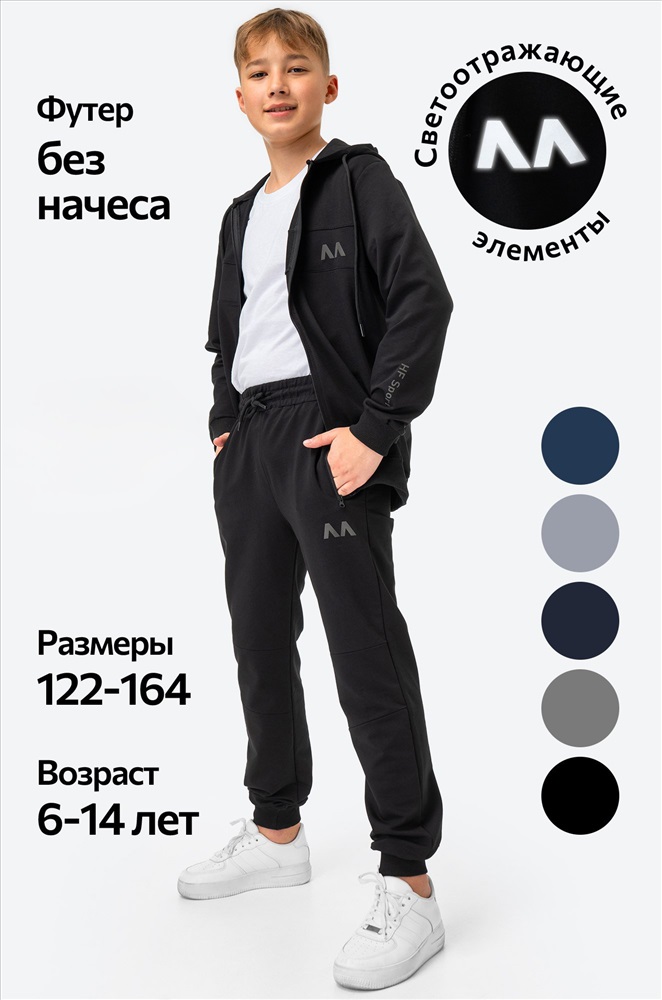 Комфорт в каждом движении! Детский спортивный костюм с брюками для мальчиков и девочек выполнен из плотного футера двухнитки. Толстовка с застежкой на молнию, глубокий капюшон, мягкие манжеты и светоотражающие элементы делают черный костюм для детей и подростков стильным и практичным.