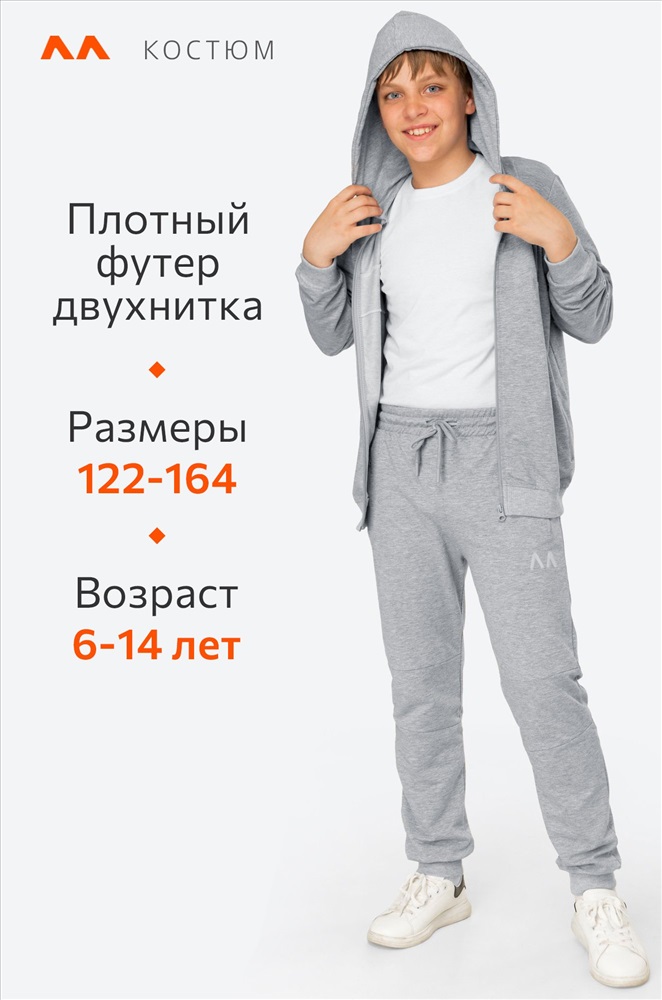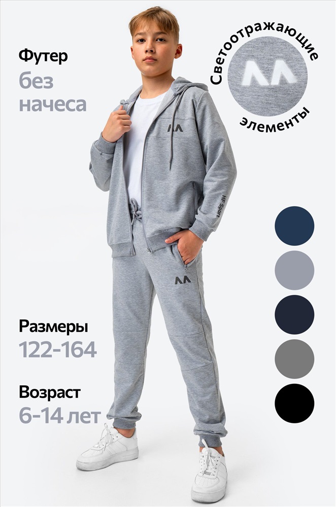 Комфорт в каждом движении! Детский спортивный костюм с брюками для мальчиков и девочек выполнен из плотного футера двухнитки. Толстовка с застежкой на молнию, глубокий капюшон, мягкие манжеты и светоотражающие элементы делают серый костюм для детей и подростков стильным и практичным.