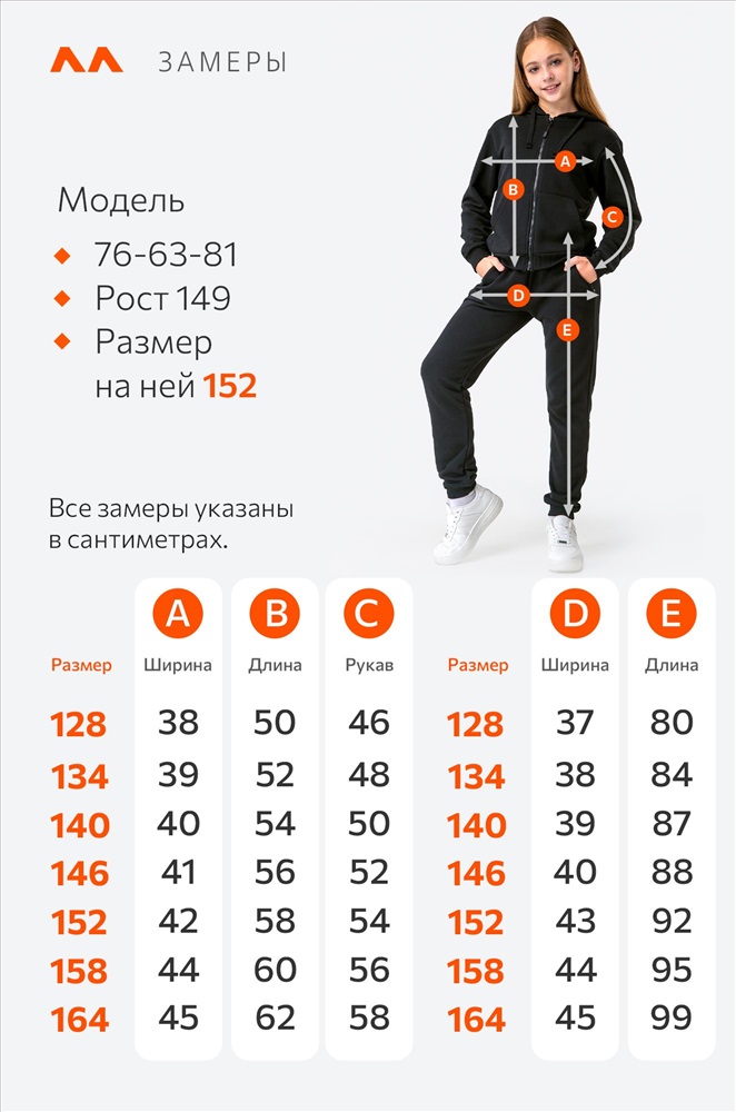 брюки: длина внеш. шва:80 см; длина внут. шва:55 см; ширина по бёдрам:37 см. Размер 134: кофта: длина:52 см; ширина:39 см; длина рукава внешняя:48 см; длина рукава внутренняя:42 см. брюки: длина внеш. шва:84 см; длина внут. шва:59 см; ширина по бёдрам:38 см. Размер 140: кофта: длина:54 см; ширина:40 см; длина рукава внешняя:50 см; длина рукава внутренняя:44 см. брюки: длина внеш. шва:87 см; длина внут. шва:62 см; ширина по бёдрам:39 см. Размер 146: кофта: длина:56 см; ширина:41 см; длина рукава внешняя:52 см; длина рукава внутренняя:45 см. брюки: длина внеш. шва:88 см; длина внут. шва:64 см; ширина по бёдрам:40 см. Размер 152: кофта: длина:58 см; ширина:42 см; длина рукава внешняя:54 см; длина рукава внутренняя:48 см. брюки: длина внеш. шва:92 см; длина внут. шва:65 см; ширина по бёдрам:43 см. Размер 158: кофта: длина:60 см; ширина:44 см; длина рукава внешняя:56 см; длина рукава внутренняя:49 см. брюки: длина внеш. шва:95 см; длина внут. шва:69 см; ширина по бёдрам:44 см. Размер 164: кофта: длина:62 см; ширина:45 см; длина рукава внешняя:58 см; длина рукава внутренняя:50 см. брюки: длина внеш. шва:99 см; длина внут. шва:77 см; ширина по бёдрам:45 см. *замеры выборочные, могут незначительно отличаться. Комментарии к товару
