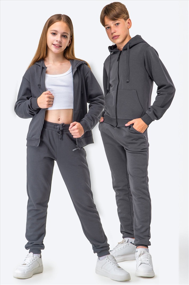Однотонный костюм двойка графитового цвета для детей и подростков выполнен из трикотажа, который идеален для осени, весны и даже зимы. Хлопковый серый костюм хорошо тянется и держит форму даже после частых стирок благодаря добавлению полиэстера. В комплекте толстовка зипка с длинными рукавами и штаны джоггеры. Эластичные манжеты не позволяют рукавам и штанинам задираться при активных движениях, уютный карман-кенгуру согревает руки в прохладную погоду, а капюшон защищает от ветра. Посадку можно отрегулировать удобным шнурком на поясе. Трикотажный брючный костюм идеален для осенних, весенних дней и зимних дней. Костюм из хлопка станет отличным вариантом для повседневных прогулок и тренировок. Подростковый демисезонный костюм идеален в качестве спортивной формы для уроков физкультуры в школе. В нем удобно заниматься спортом в школьных секциях и бегом на улице. Спортивки и худи на молнии можно носить как вместе, так и по отдельности, создавая крутые образы в уличном стиле. Модель Вероника, ее рост 149 см, параметры 76-63-81 см. На ней размер 152. Модель Данила, его рост 160 см, параметры 76-67-78 см. На нем размер 158.