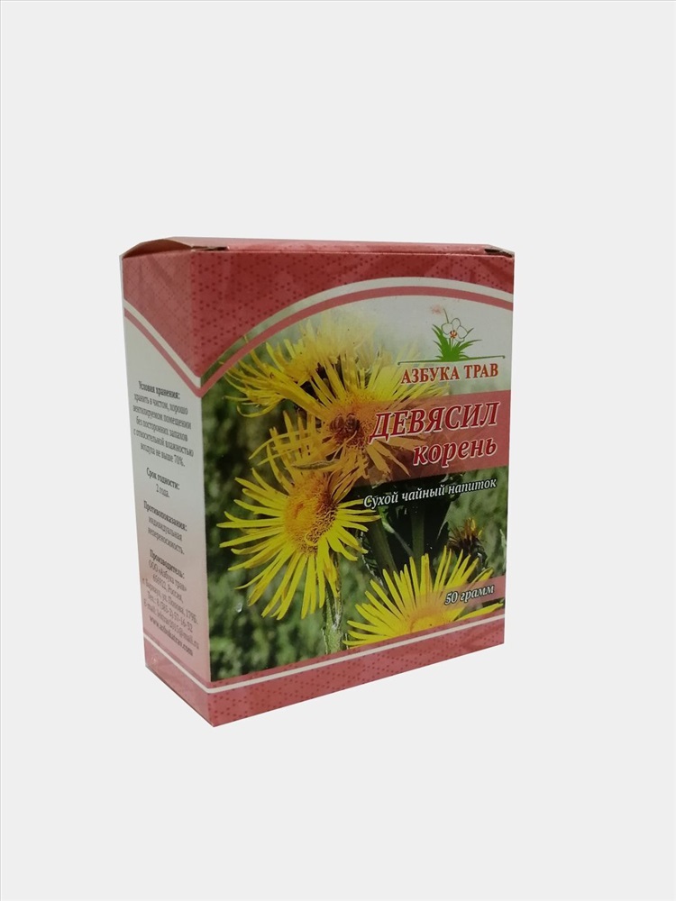 50 грамм сушенных корней девясила в индивидуальной упаковке.