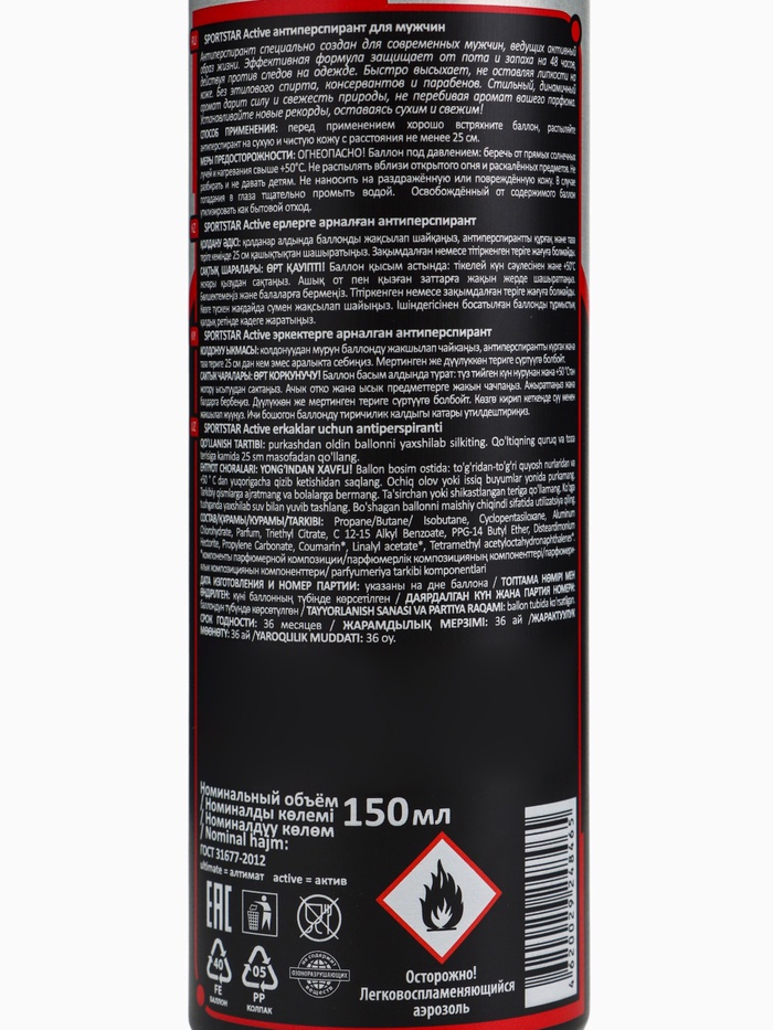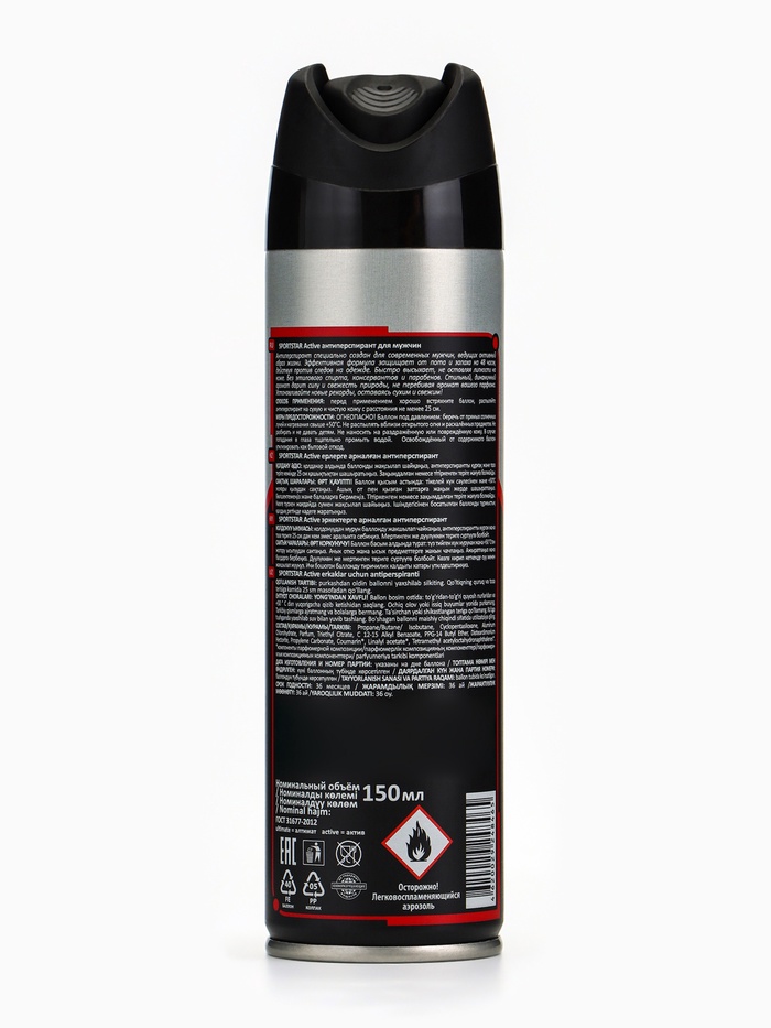 Габариты: 4,5 x 4,5 x 17 Страна: Россия В боксе: 12 шт Состав: См. на упаковке Материалы: см. на упаковке Фасовка: по 1 шт Индивидуальная упаковка: Без упаковки Сертификат: ЕАС Вес, г/Объём, мл: 150 Аромат: Древесные ноты, Восточные специи, Мускус Форма выпуска: Аэрозоль SPORTSTAR Active антиперспирант для мужчин специально создан для современных мужчин, ведущих активный образ жизни. Эффективная формула защищает от пота и запаха на 48 часов, действуя против следов на одежде. Быстро высыхает, не оставляя липкости на коже. Без этилового спирта, консервантов и парабенов. Стильный, динамичный аромат дарит силу и свежесть природы, не перебивая аромат вашего парфюма. Устанавливайте новые рекорды, оставаясь сухим и свежим! Способ применения: перед применением хорошо встряхните баллон, распыляйте антиперспирант на сухую и чистую кожу с расстояния не менее 25см. СоставPropanе/Butane/Isobutane, Cyclopentasiloxane, Aluminum Chlorohydrate, Parfum, Triethyl Citrate, С 12-15 Alkyl Benzoate, PPG-14 Butyl Ether, Disteardimonium Hectorite, Propylene Carbonate, Coumarin*, Linalyl acetate*, Tetramethyl acetyloctahydronaphthalenes*. * - компоненты парфюмерной композиции"Комментарии к товару