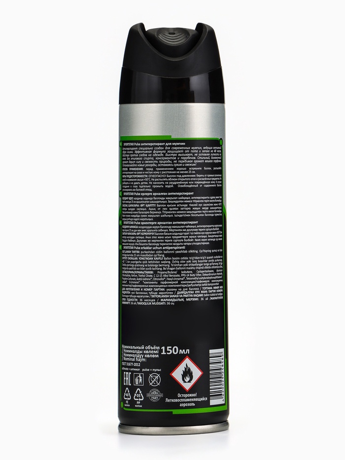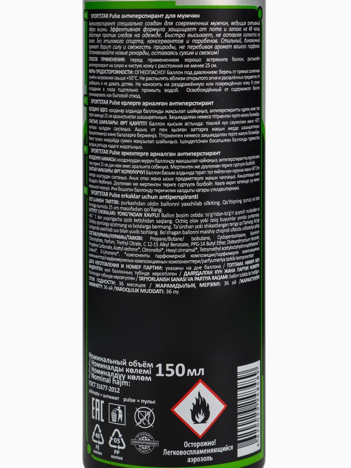 Габариты: 4,5 x 4,5 x 17 Страна: Россия В боксе: 12 шт Состав: См. на упаковке Материалы: см. на упаковке Фасовка: по 1 шт Индивидуальная упаковка: Без упаковки Сертификат: ЕАС Вес, г/Объём, мл: 150 Аромат: Свежесть Форма выпуска: Аэрозоль SPORTSTAR Active антиперспирант для мужчин специально создан для современных мужчин, ведущих активный образ жизни. Эффективная формула защищает от пота и запаха на 48 часов, действуя против следов на одежде. Быстро высыхает, не оставляя липкости на коже. Без этилового спирта, консервантов и парабенов. Стильный, динамичный аромат дарит силу и свежесть природы, не перебивая аромат вашего парфюма. Устанавливайте новые рекорды, оставаясь сухим и свежим! Способ применения: перед применением хорошо встряхните баллон, распыляйте антиперспирант на сухую и чистую кожу с расстояния не менее 25см. СоставPropanе/Butane/Isobutane, Cyclopentasiloxane, Aluminum Chlorohydrate, Parfum, Triethyl Citrate, С 12-15 Alkyl Benzoate, PPG-14 Butyl Ether, Disteardimonium Hectorite, Propylene Carbonate, Acetyl cedrene*, Citronellol*, Hexyl cinnamal*, Tetramethyl acetyloctahydronaphthalenes*, Linalool*, D-Limonene*. * - компоненты парфюмерной композицииКомментарии к товару